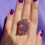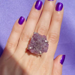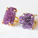 I work with a family run mine in Brazil, where these natural Amethyst clusters are sourced. They are raw, one of a kind, with custom made ring bands that perfectly fit these stones, and adjust to any size!