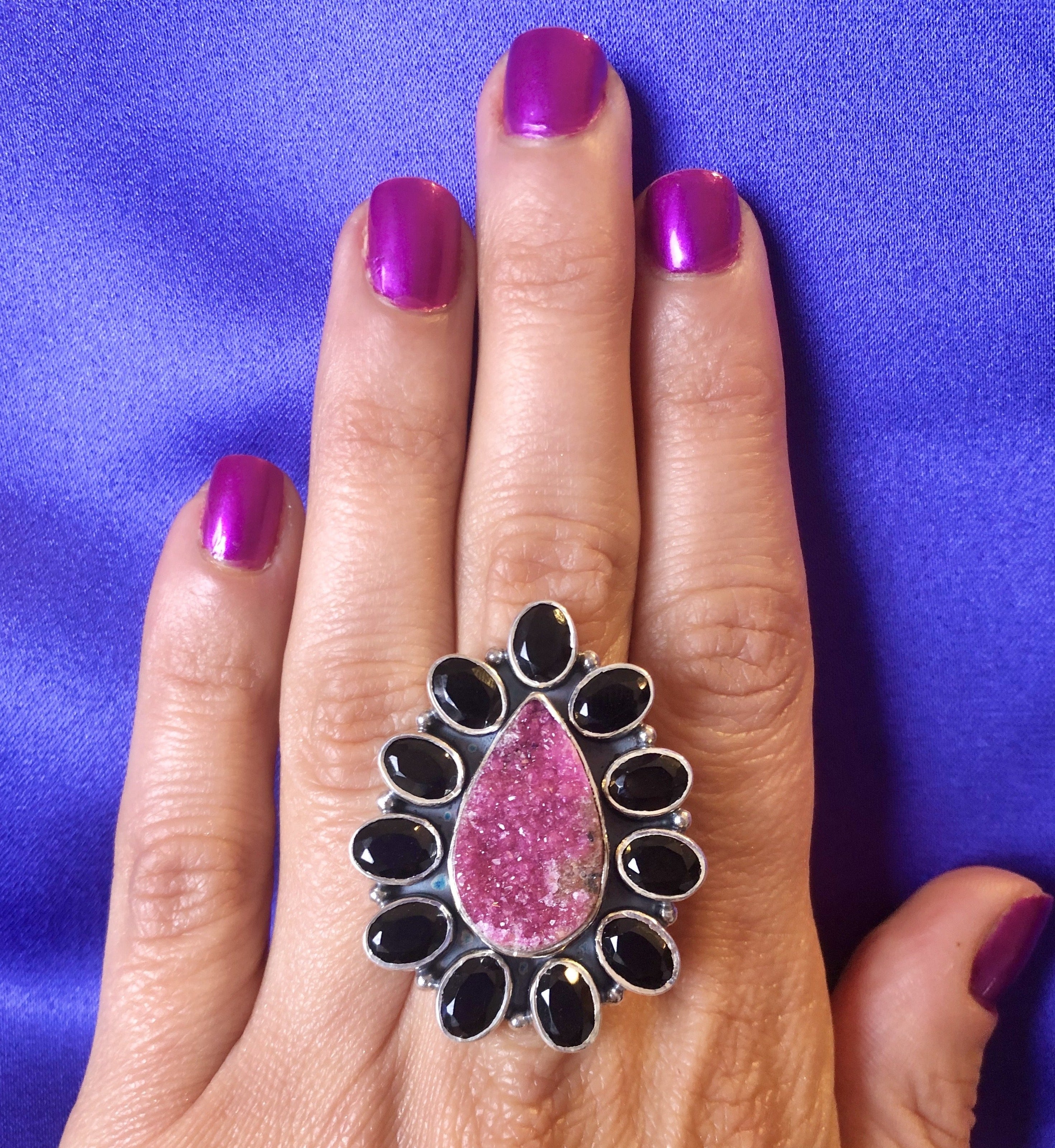 This stunner is a powerful statement ring! Handmade from Cobalt Calcite (pink) and black onyx.