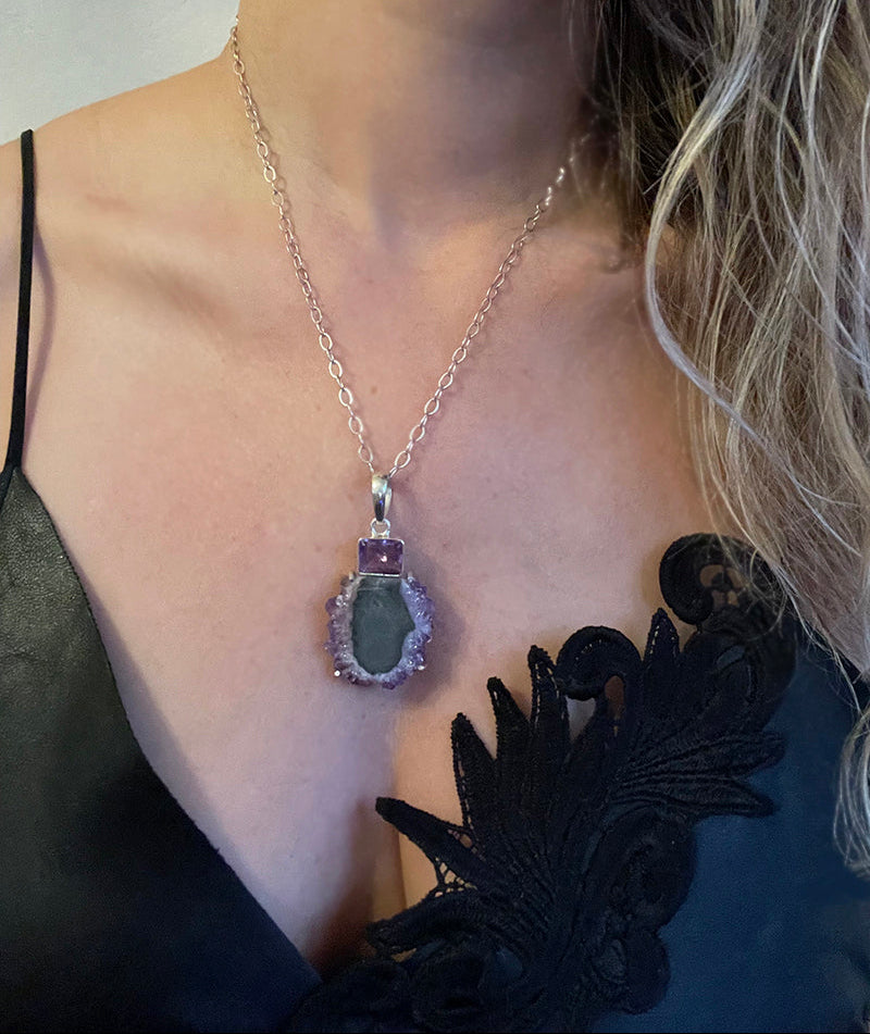 Stunning & rare, you'll feel like a bohemian crystal queen! Rock a natural crystal flower that forms deep in the earth. Featuring a rare stalactite slice from Uruguay paired with a faceted Amethyst crystal. In a crystal cave, sometimes the stalactites that form from the top of the cave by dripping down over MILLIONS of years, get covered in crystals. Estimated to be 130 million years old! When you slice it, it looks like a flower inside! It just blows my mind. Each stone is one-of-a-kind as in nature. I spend hours going through 100's to hand select the prettiest stalactites for you!