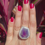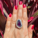 A real treasure! These are rare Amethyst Geodes where Amethyst grows inside of quartz! It has a 3D effect inside and many have unique prisms inside. Each is one of a kind as in nature. With black tourmaline inclusions, to block you from bad energy! These are powerful healing stone rings with the calming energy of amethyst & the clarity and manifesting energy of quartz. This formation makes it the perfect stone to use for manifestation of your dreams.