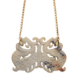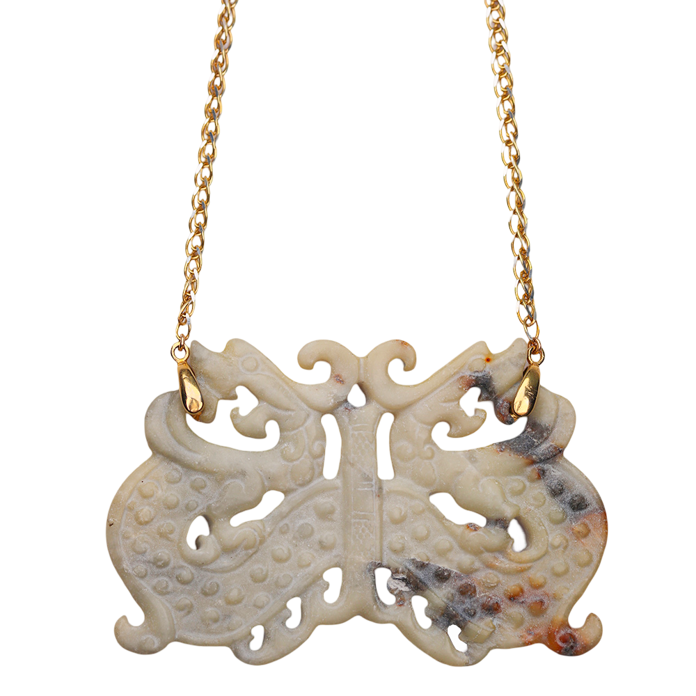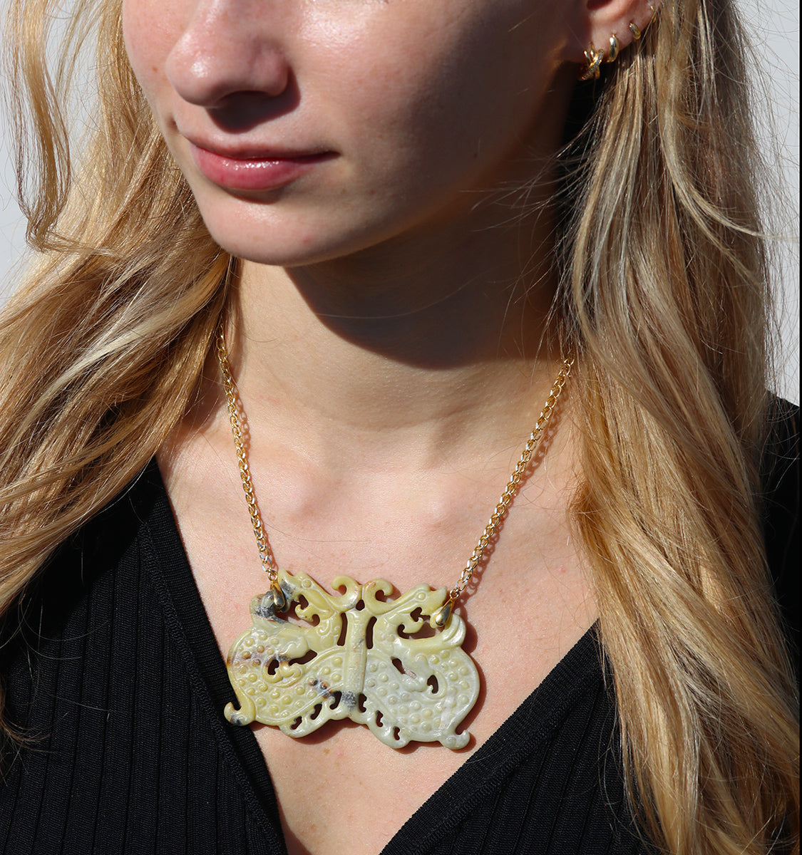 I acquired a jade collection from someone who passed away in Hawaii, I purchased from an antique shop. We do not know the age as they were sold by the person's children. After research we have found that this is old antique Chinese celadon and russet jade, 2 carved dragons, carved on both sides, and happen to also look like a butterfly! I added the chain to up-cycle it into a one of a kind statement necklace! I added a photo I took from the Natural history museum in NYC as a piece resembles this jade dragon carving from Ming dynasty 1368-1644.