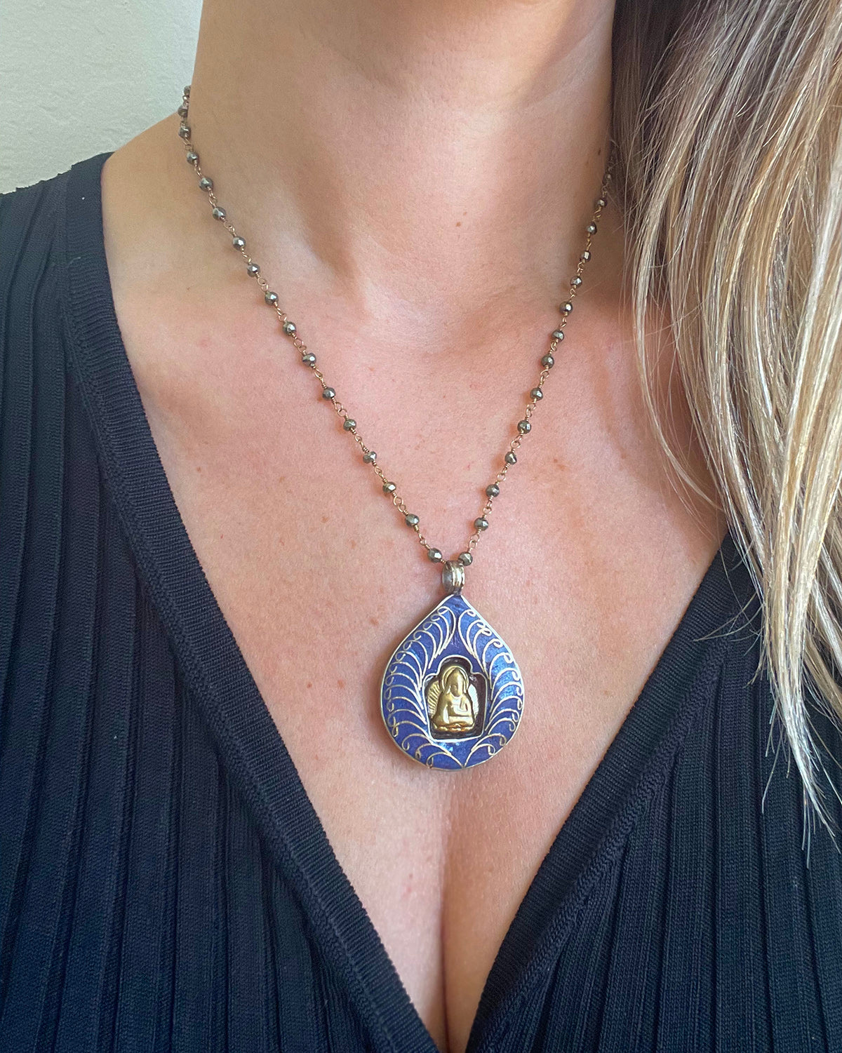 This unique vintage piece was handmade in Tibet. Hand carved from wood, then hand painted & edges with brass to create the pendant back & bail. I strung on a gold filled hand wire wrapped pyrite beaded chain. This statement piece adds bohemian glamour to a casual or dressy look. I imagine it with a printed top or dress, with a simple button down shirt or v-neck sweater. Being mixed metal it will easily pair with your silver or gold jewelry.