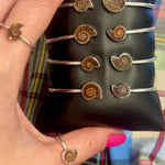 Ammonite is the shell of an extinct ocean creature twice as old as dinosaurs! Each is uniquely its own as they are all natural fossils. This bangle add a bada** bohemian edge to any outfit. Each is custom set in solid 925 sterling silver, to secure each fossil.