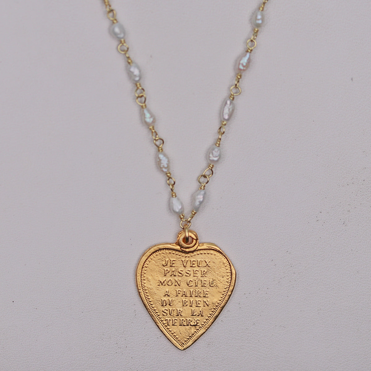 Inscribed in a French saying that translates to: "I want to spend my heaven doing good on earth". A heart to spread love, with 2 roses, a symbol of love & romance, carved by hand.