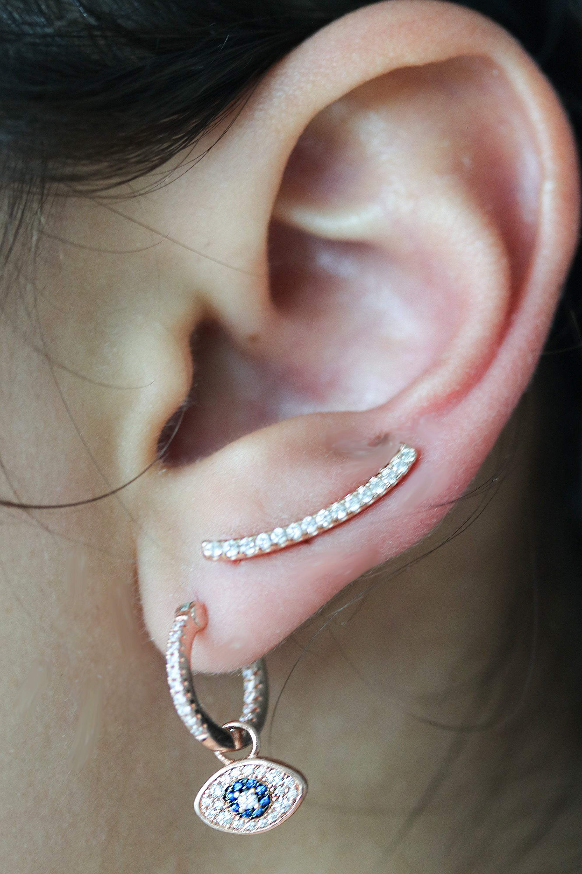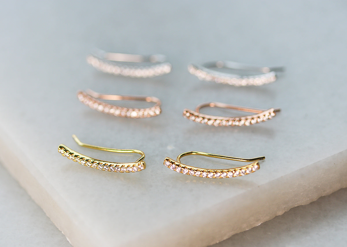 The multiple piercing look for the girls that can't commit. Minimal and chic, this style is my go-to earring for everyday and way better than basic studs! It also looks awesome in the second piercing going up the ear! To wear, put the post through the piercing like a drop earring, flip up, pull onto the ear and pinch to lay flat on the lobe. The climber stays put all day and is super comfortable!