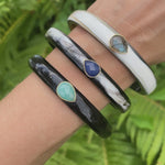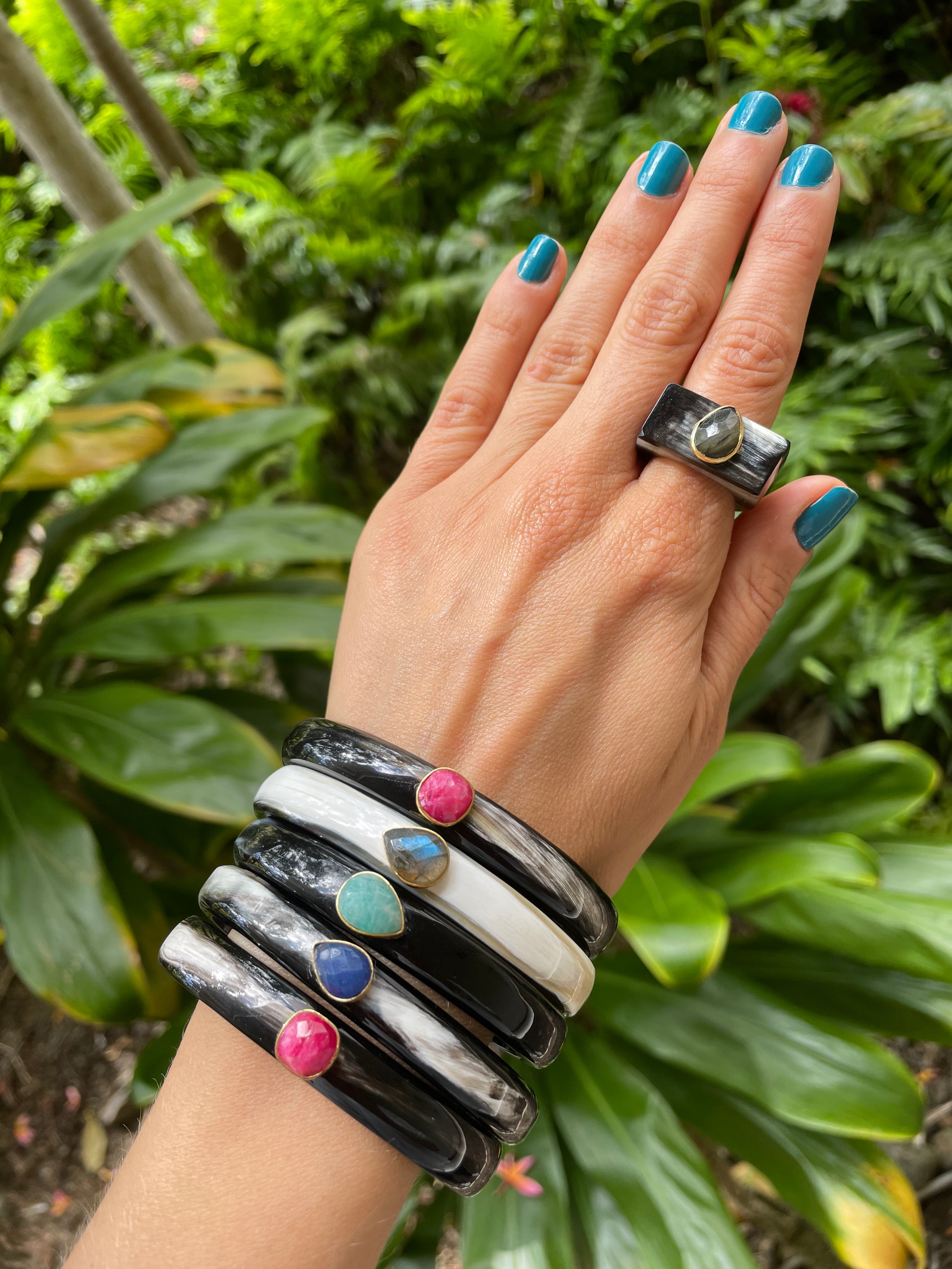 Super lightweight & stackable, these bangles are carved from Buffalo horn, a 14k bezel is formed around a natural faceted stones.