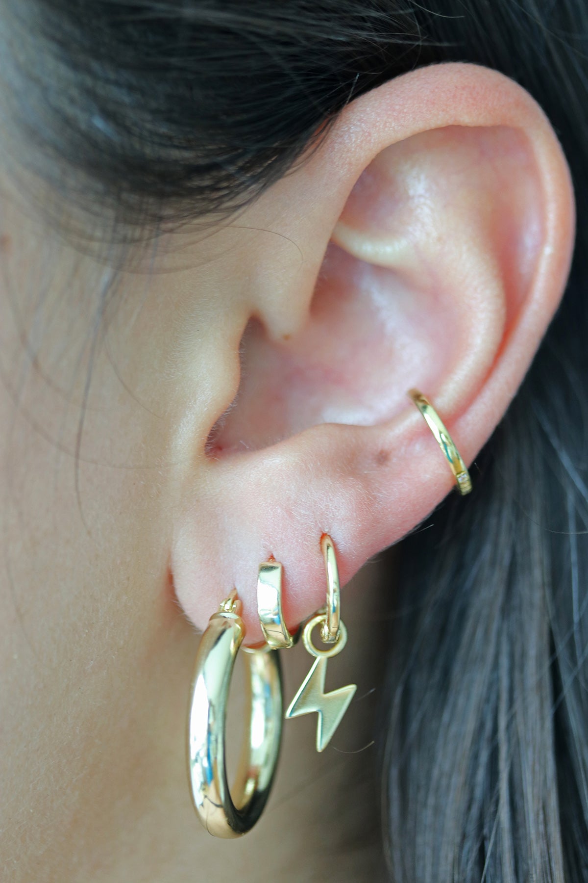 photo 1: Pictured with Classic Gold hoops, Classic Ear Huggie, Lightning bolt charm huggie & Crystal ear cuff (flipped backwards is plain metal)