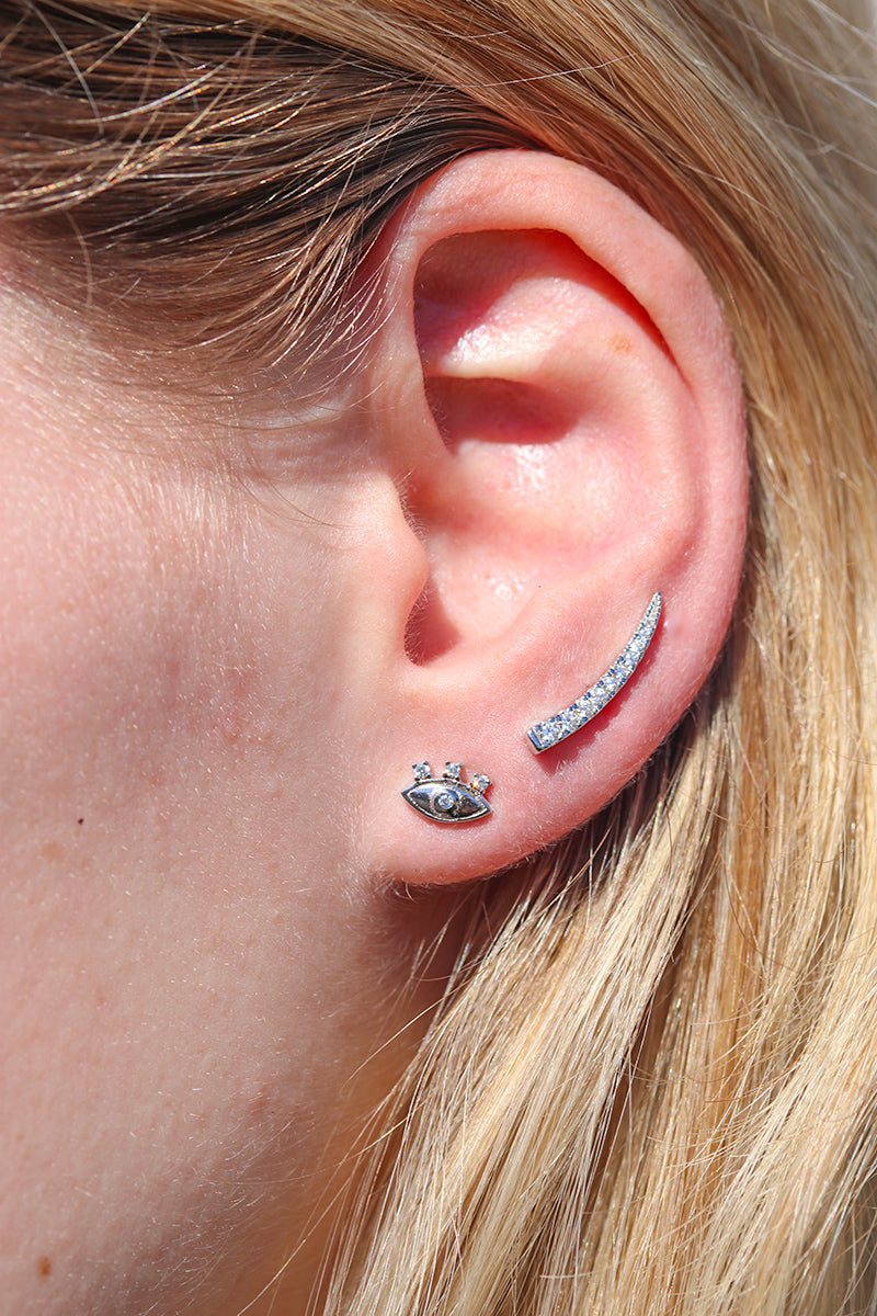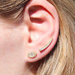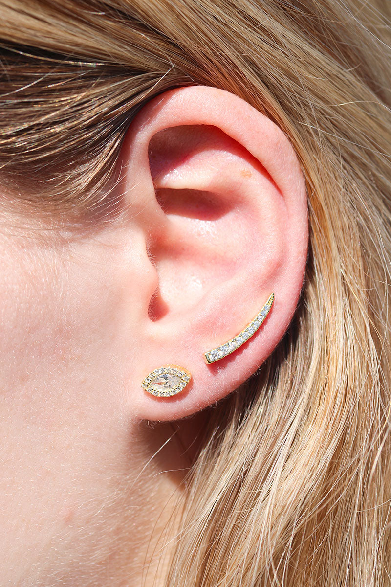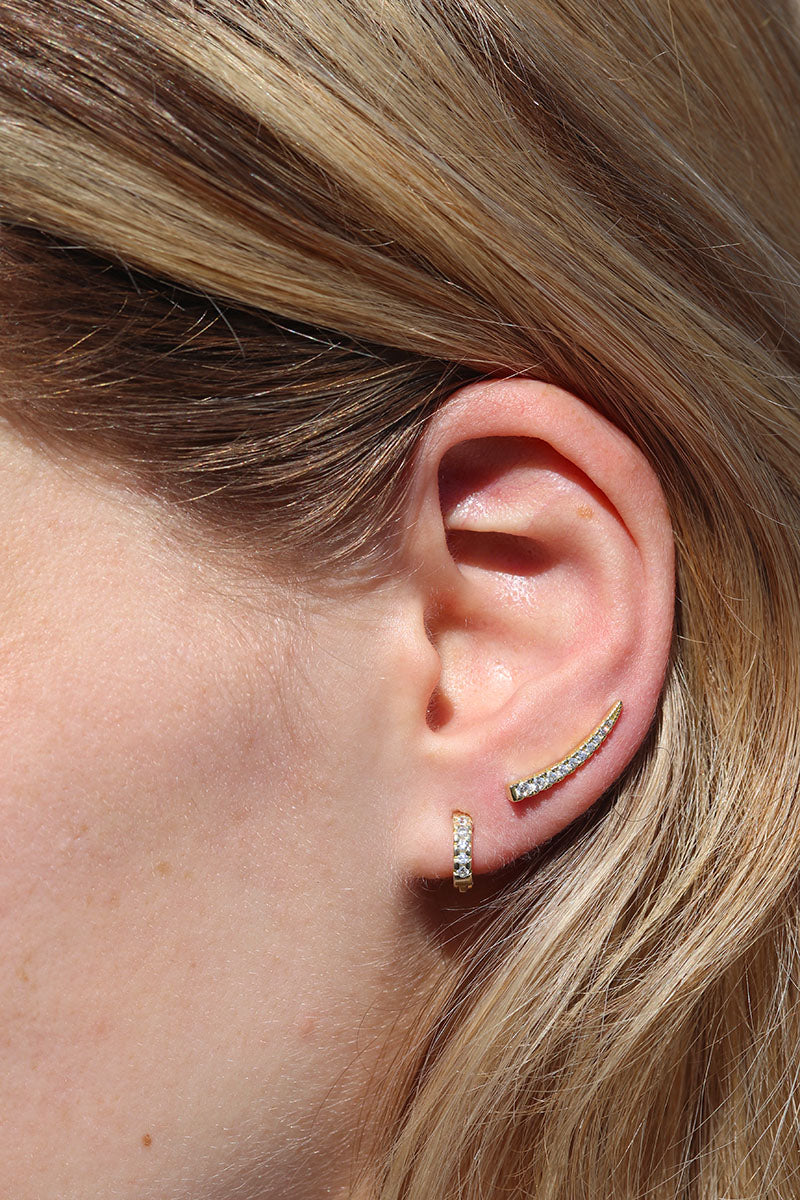 Minimal and chic, this style is my go-to earring for everyday and way better than basic studs! Wear in your 1st hole, plus short enough to wear in 2nd, 3rd, going up or top piercing going down! To wear, put the post through the piercing like a drop earring, flip up, pull onto the ear and pinch to lay flat on the lobe. The climber stays put all day and is super comfortable! No need for earring backs as it sits flat on the ear & doesn’t come off. It’s flat back, so very comfortable to sleep in as well.