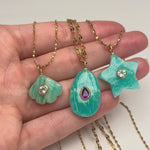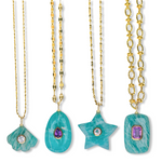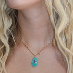 A beautiful pop of color, like ocean waves in a stone, these necklaces make the outfit! The perfect one of a kind treasure to cherish always. These are hand cut stones, a hole was drilled inside, with a sparkly faceted gem custom set inside each one. Made with 925 sterling silver, 18k plated. Each is one of a kind, once sold it's gone forever! Waterproof, tarnish free metal.
