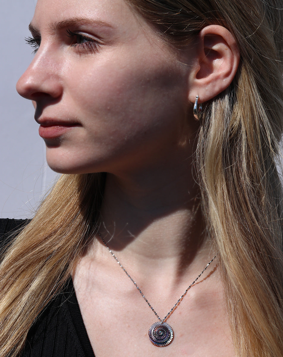 Weightless, high shine, with a unique rainbow sheen! Paired with a glittery chain, waterproof and durable for daily wear. Can be worn alone or layered.
