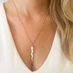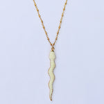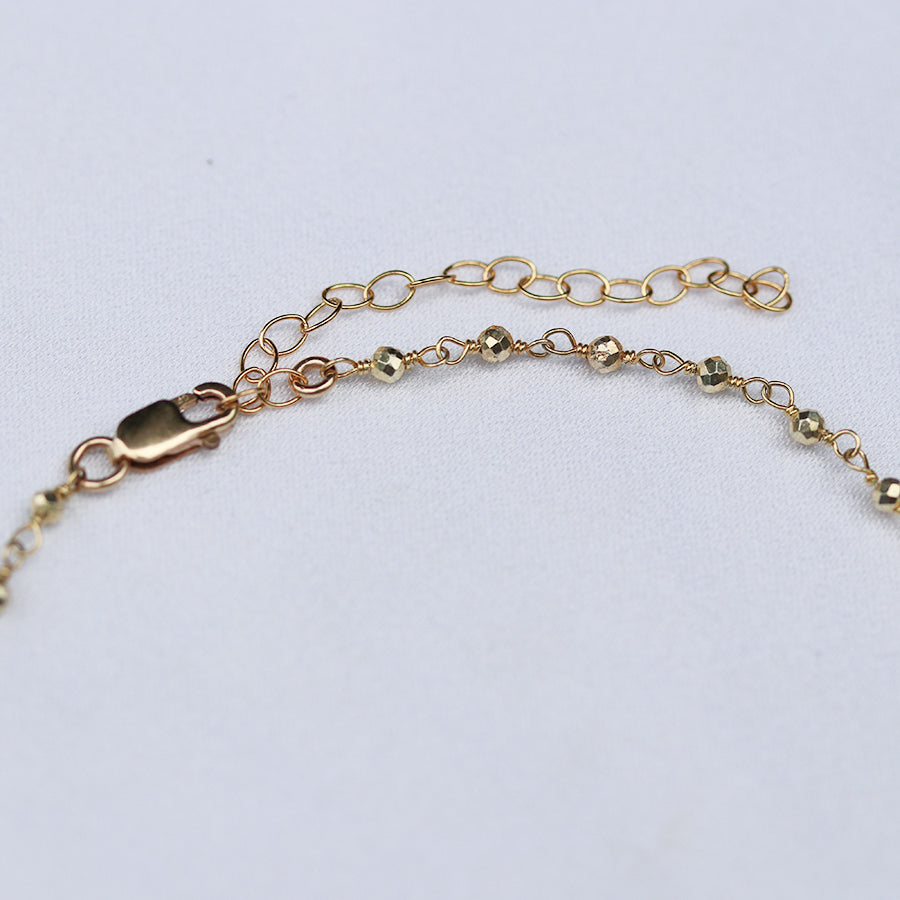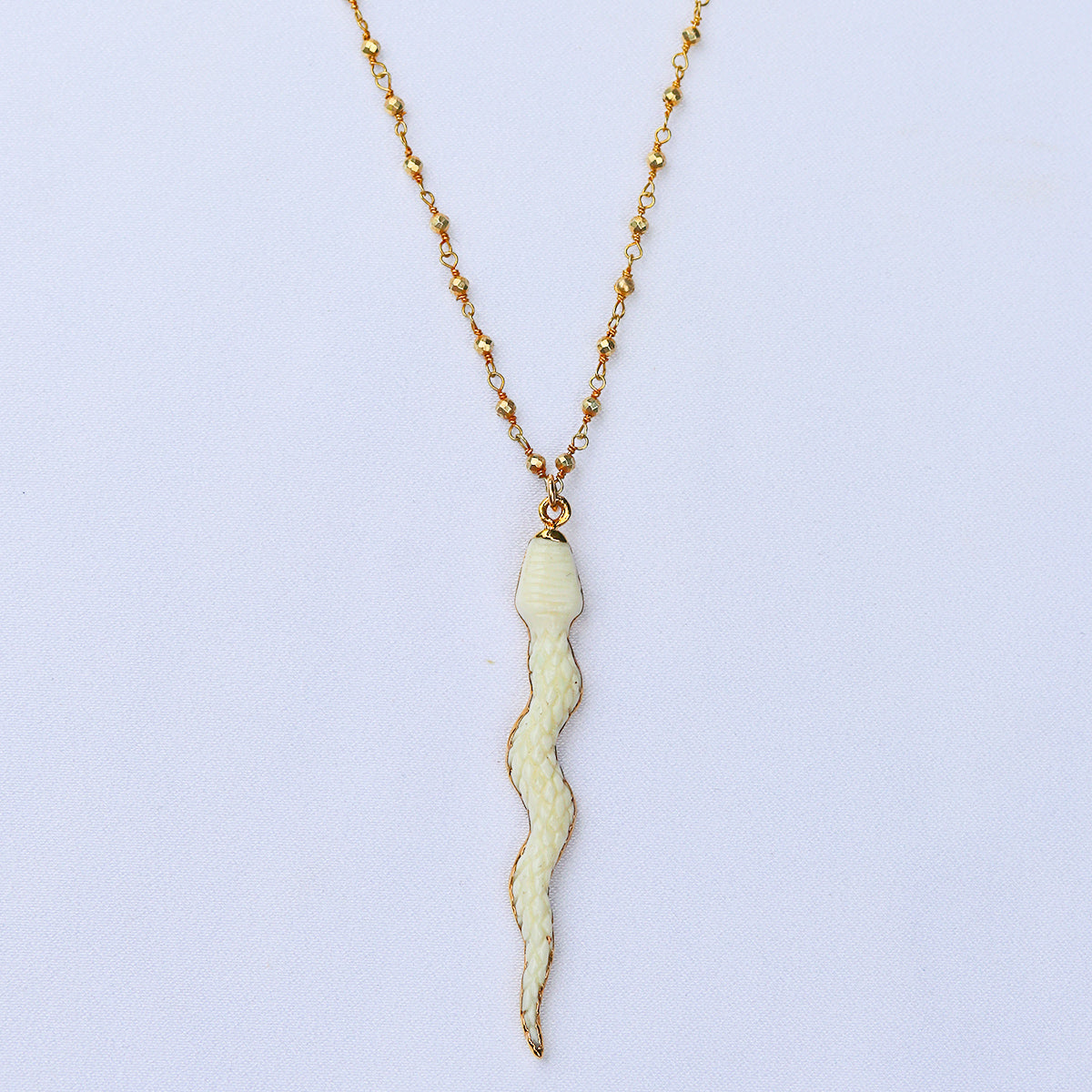 The serpent or snake is revered worldwide as a symbol to represent our balance between good & evil as depicted by the snake from the Garden of Eden. This creature having the ability to shed its old skin and starting fresh, metaphorically represents the release of old ways of thinking that no longer work in our lives. The chain is all gold filled, wire wrapped with glittering gold beads.