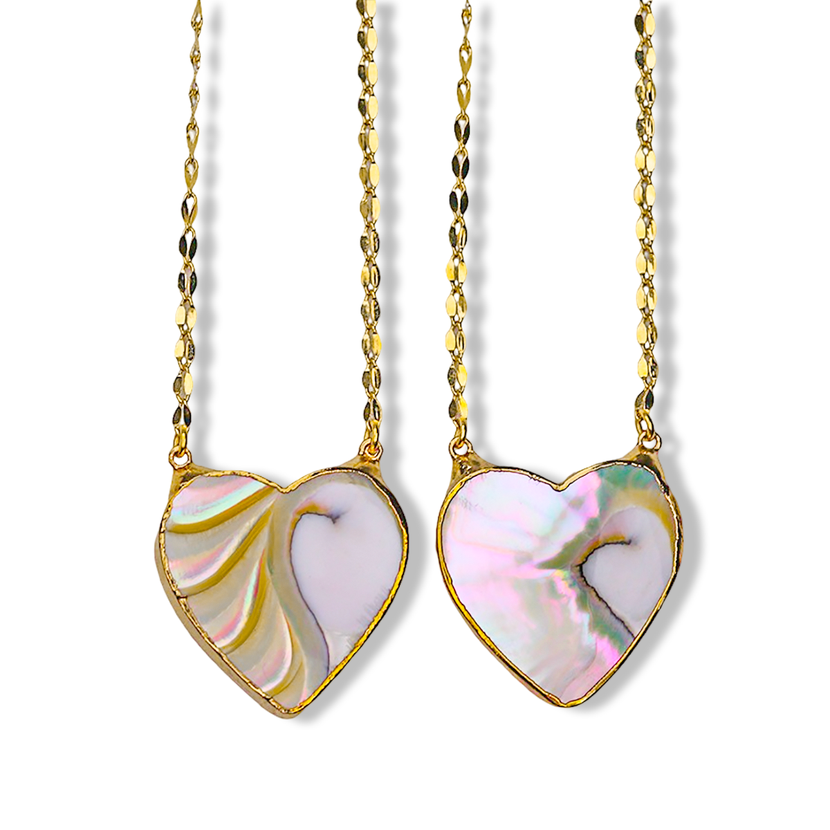 Natural shell hearts filled with rainbow iridescence?! Obsessed! I love how the rainbow flash changes with the angle, and each side is beautiful & slightly unique! I only have 2 available and I made these by hand. The shells have been electroplated with 24k gold, on a gold-filled chain.