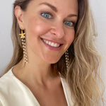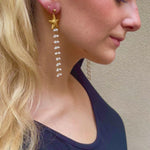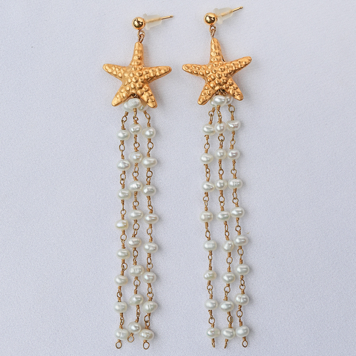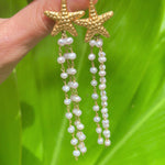 Under the sea meets the cosmos. The trail of the shooting star is dotted with pearls! The starfish are handmade by an indigenous Thai hill tribe from sterling silver, then plated in 14k gold in Rhode Island. They are very lightweight but perfect for a night out dancing as they have immediate movement on their own! These lovely long earrings pop out when you walk and show up even with long hair worn down when other earrings tend to disappear in photos.