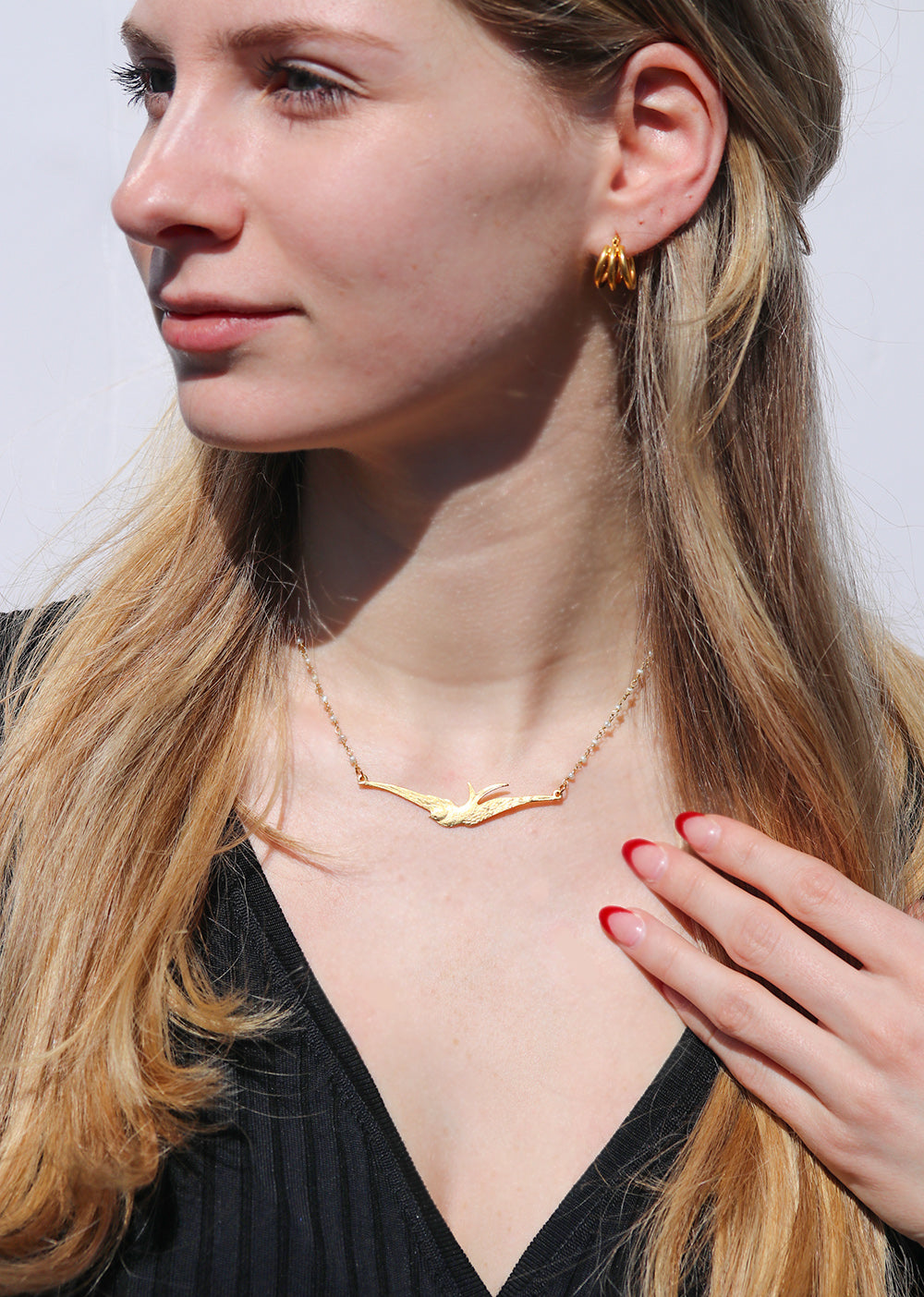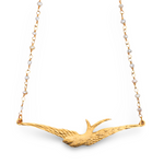 "Until you spread your wings, you'll have no idea how far you can fly". -Napolean Bonaparte. A symbol of freedom, a daily reminder to take chances. Carved by hand, cast in 925 sterling, 14k gold plated. Made to sit short, right under the collarbone. Looks great with high neck tops, and layered with a longer necklace as well!