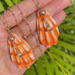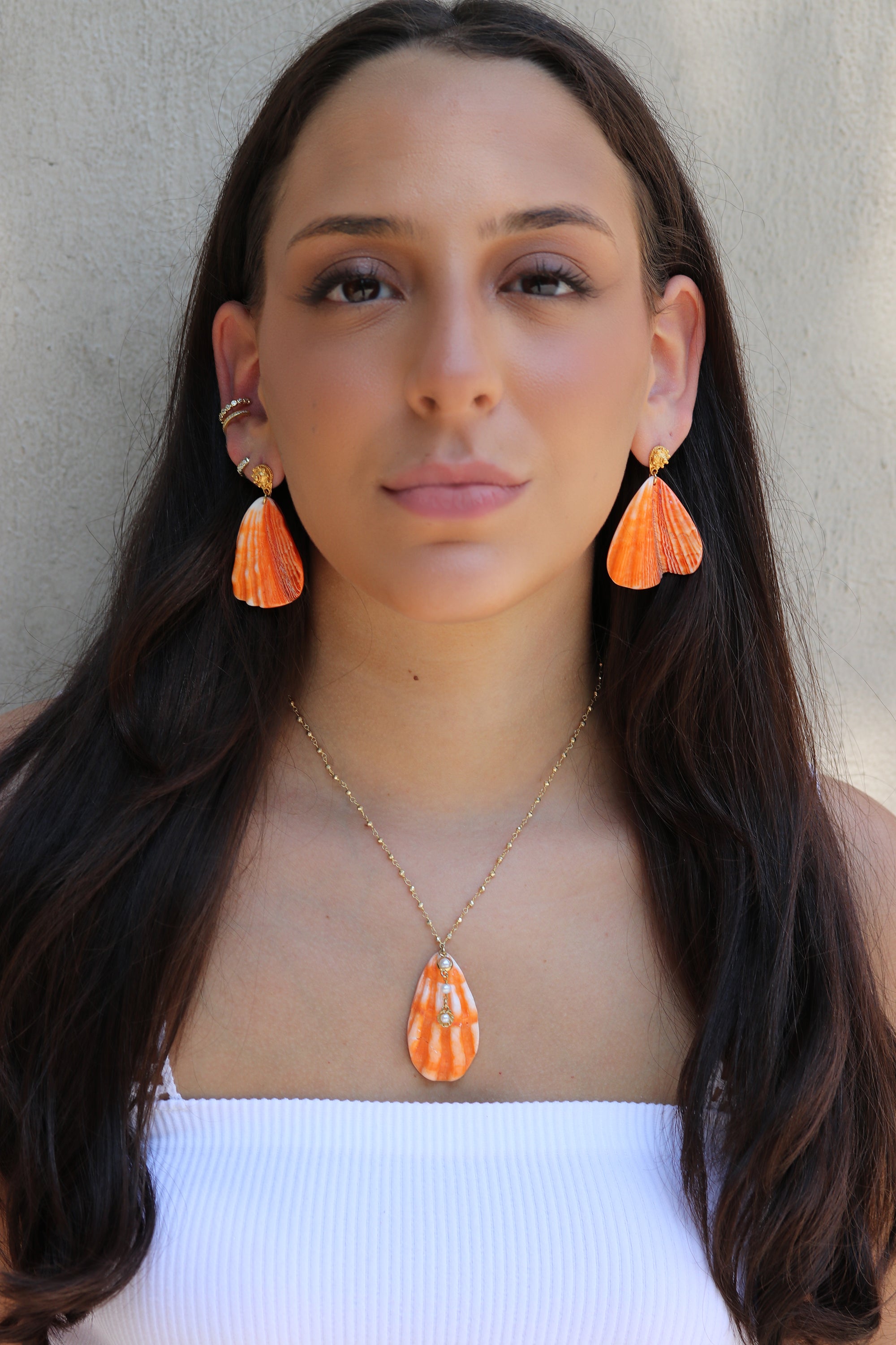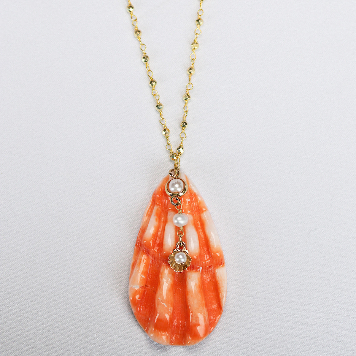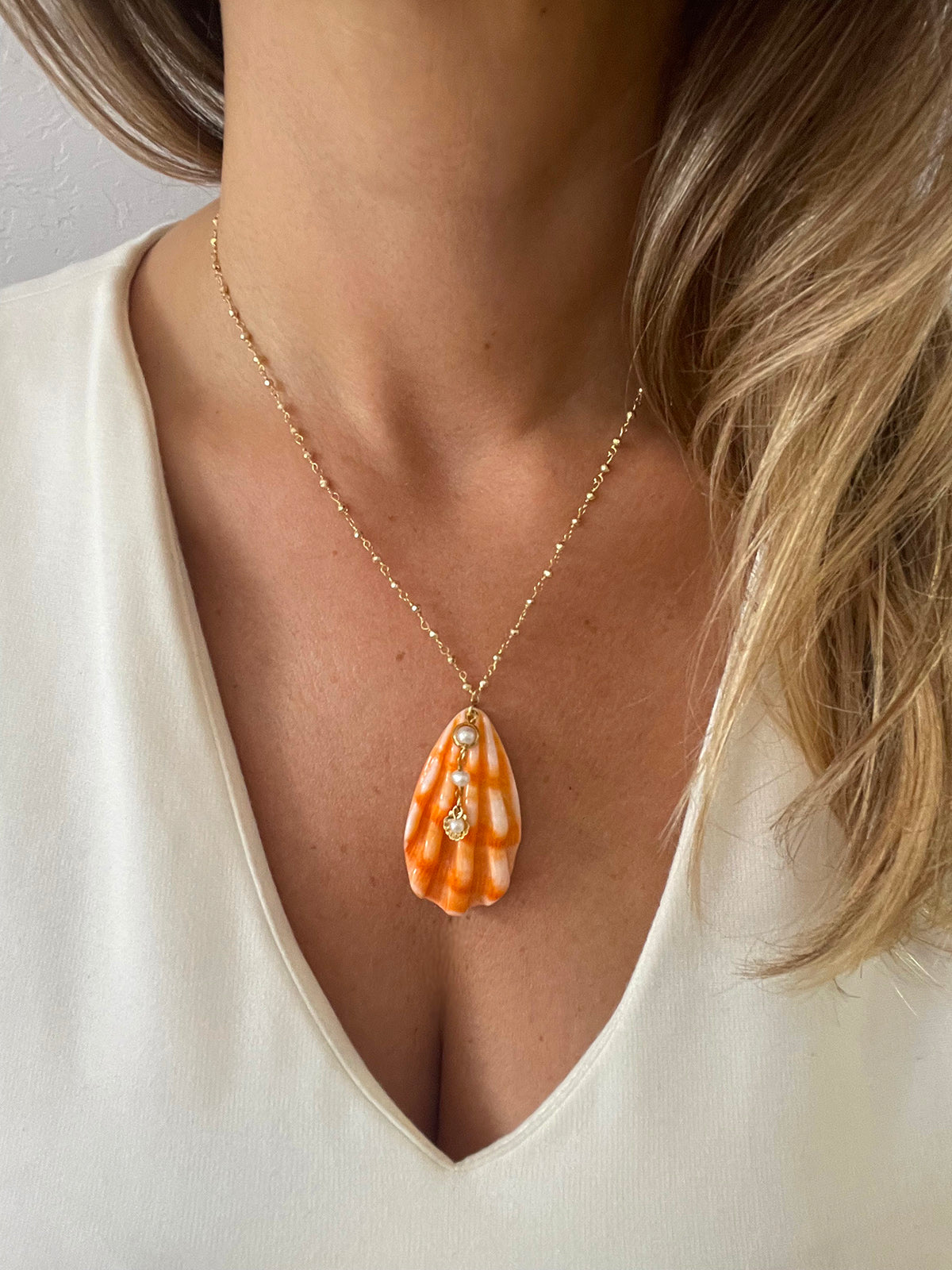 Channel your inner Ariel wearing this natural neon orange shell treasure! I love taking unique natural materials and adding chic details. Natural orange shell pops in photos for an instant tropical vibe! I combined it with a glittering gold-filled beaded chain and 3 tiny pearl details. I only made 2 and each was handmade by me in Hawaii!