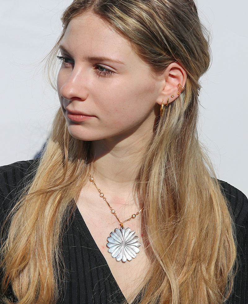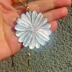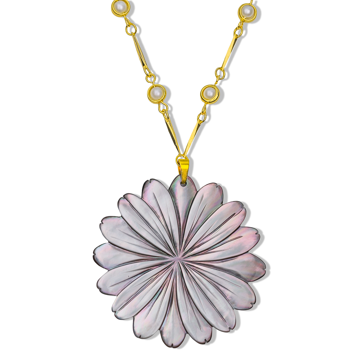 Mentally take yourself on vacation wearing this statement necklace! Naturally iridescent, and gives a two tone, mixed metal look, neutral to match everything. Black mother of pearl, carved into a zinnia,