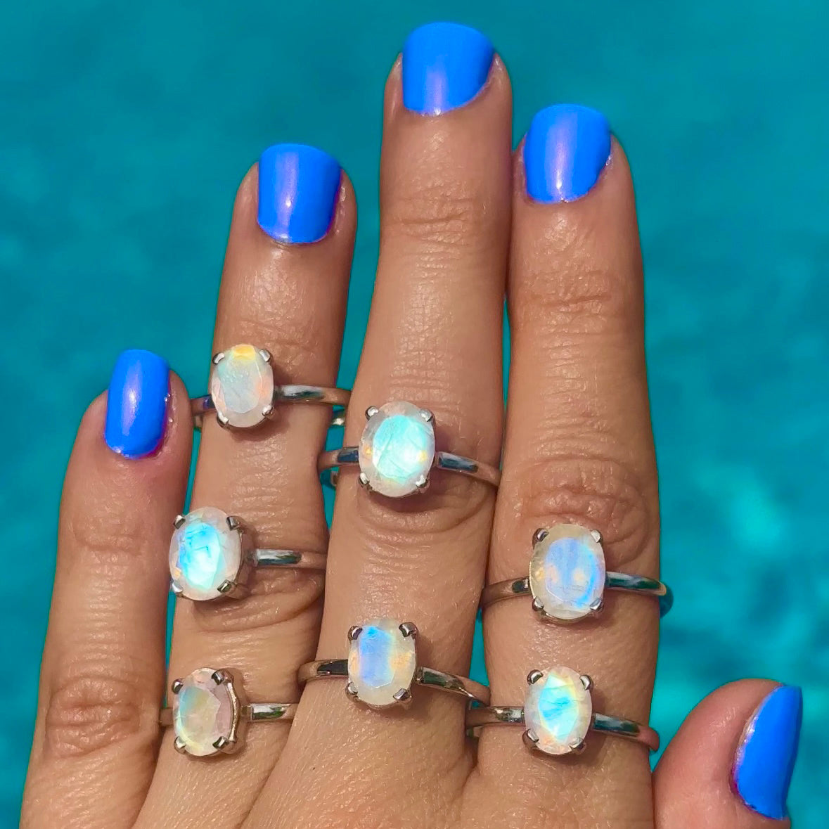Moonstone is my personal favorite stone! These rainbow & blue flashy moonstones just get my heart! Mined in India, I source direct and spend dozens of hours sorting through moonstones curating the most stunning selection for you. Each ring features a custom cut faceted stone, and each is handmade to perfectly secure each stone. Solid sterling silver, and safe to wash your hands with them on. Each is uniquely one of a kind, and can never be recreated, as in nature!