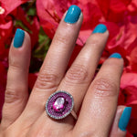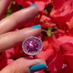 A large, luxurious & rare natural Pink Sapphire! Surrounded by natural rubies and a border of white topaz to look like diamonds. These are the biggest & boldest in my luxury gemstone collection. The colors are incredibly rich and the faceting adds great sparkle. These are investment pieces to add luxury to your life, because we deserve it ladies!