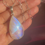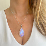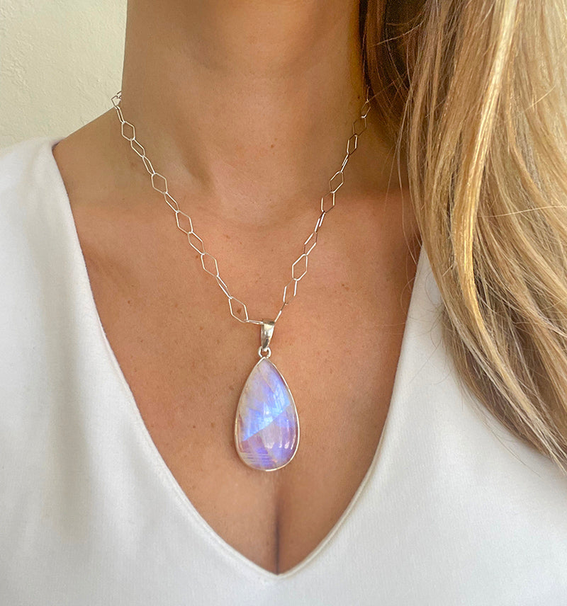 Hello moonstone maven! The bigger the better, as you get the best blue flash! Handmade in USA, and filled with good moonstone energy! Hand cut stones hand set to perfectly secure & showcase each stone. The chain is solid sterling, with a unique strong diamond link that creates a statement yet still delicate. You can slide off the pendant to wear the chain alone.