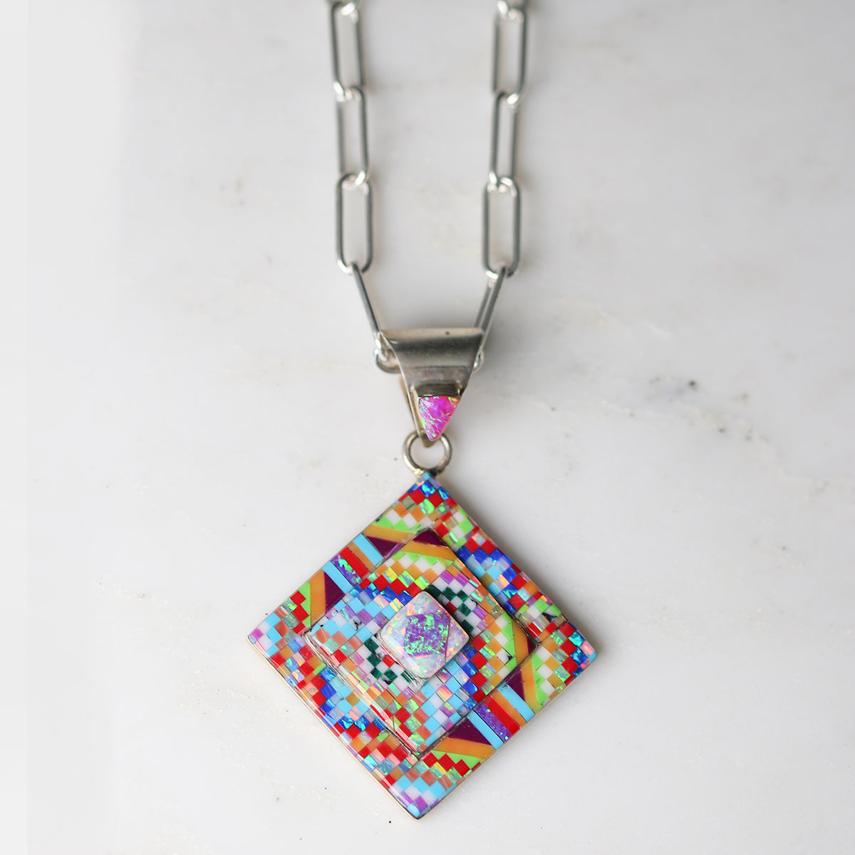 These jewels are mini masterpieces- each stone is hand cut & inlaid into this mosaic design, taking days to complete. I proudly work with a Native American family, who create every piece, one by one for you. Your purchase directly supports the artwork of the indigenous community. True collector's item!