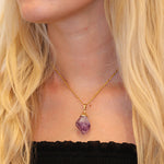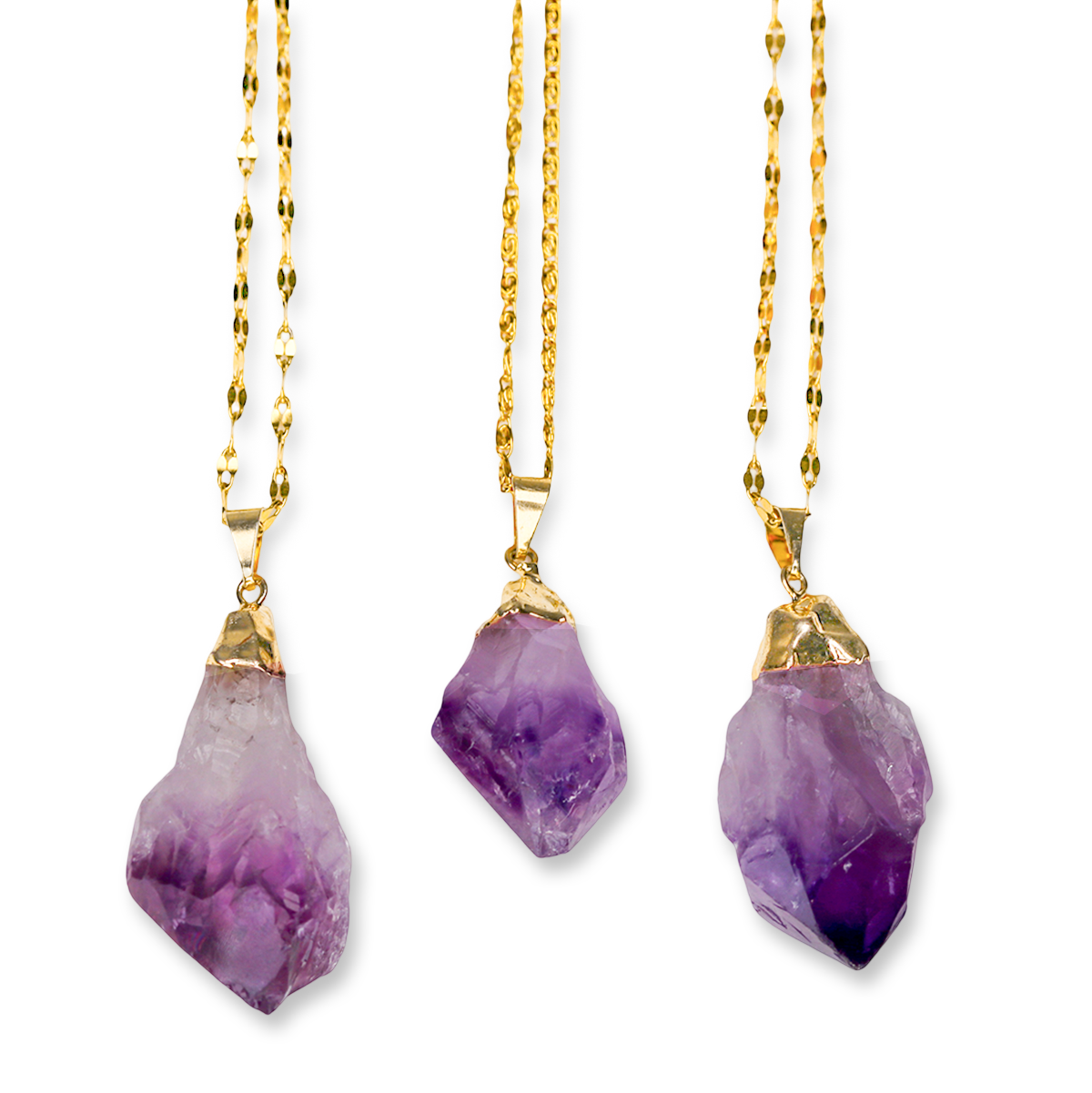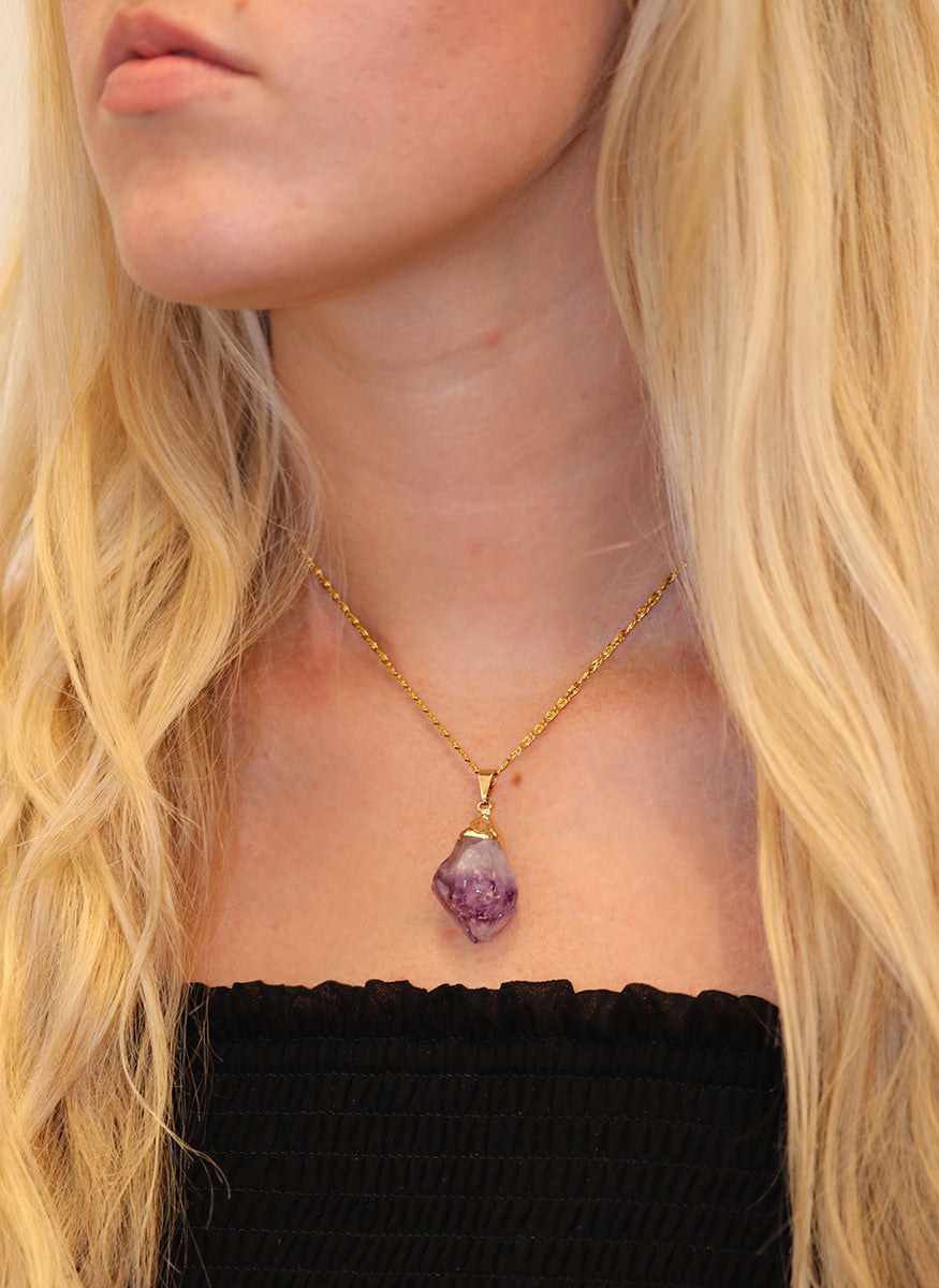 Feel like a bohemian queen wearing this Amethyst crystal! Perfect to layer, in tarnish resistant metal for everyday wear. These are raw, natural amethyst crystals, cut from the same large crystal formation, that took millions of years to form, deep in a cave in Brazil. I have been working with a family run mine for 9 years, where these are ethically mined.  An amulet to aid in meditation & create beautiful outfits!