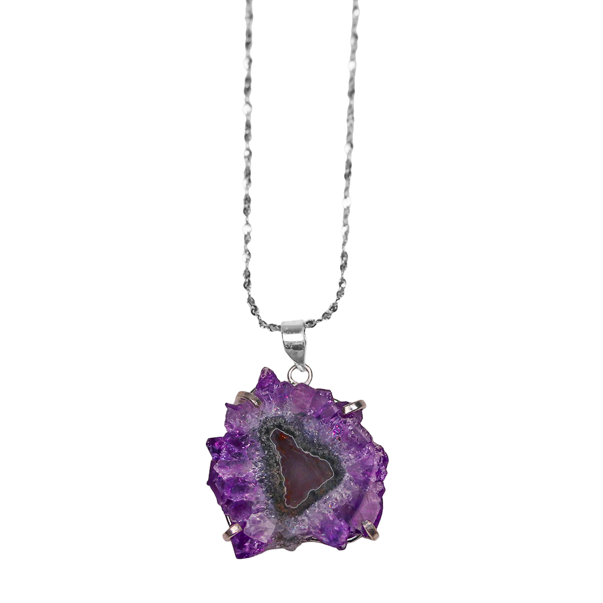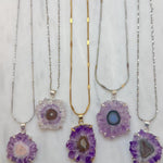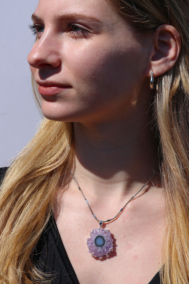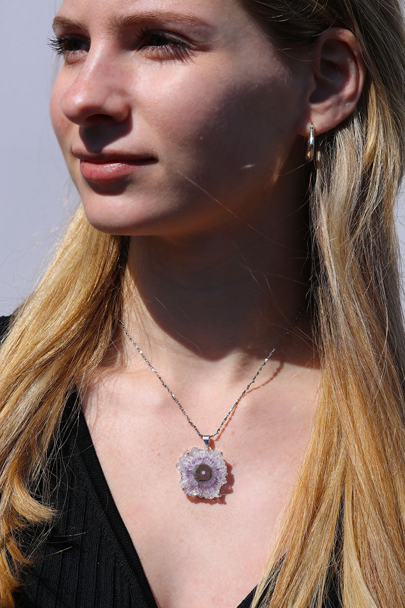 Stunning & rare, you'll feel like a bohemian crystal queen! Rock a natural crystal flower that forms deep in the earth. In a crystal cave, sometimes the stalactites that form from the top of the cave by dripping down over MILLIONS of years, get covered in crystals. Estimated to be 130 million years old! When you slice it, it looks like a flower inside! It just blows my mind. Each stone is one-of-a-kind as in nature. I spend hours going through 100's to hand select the prettiest stalactites for you!