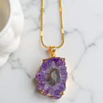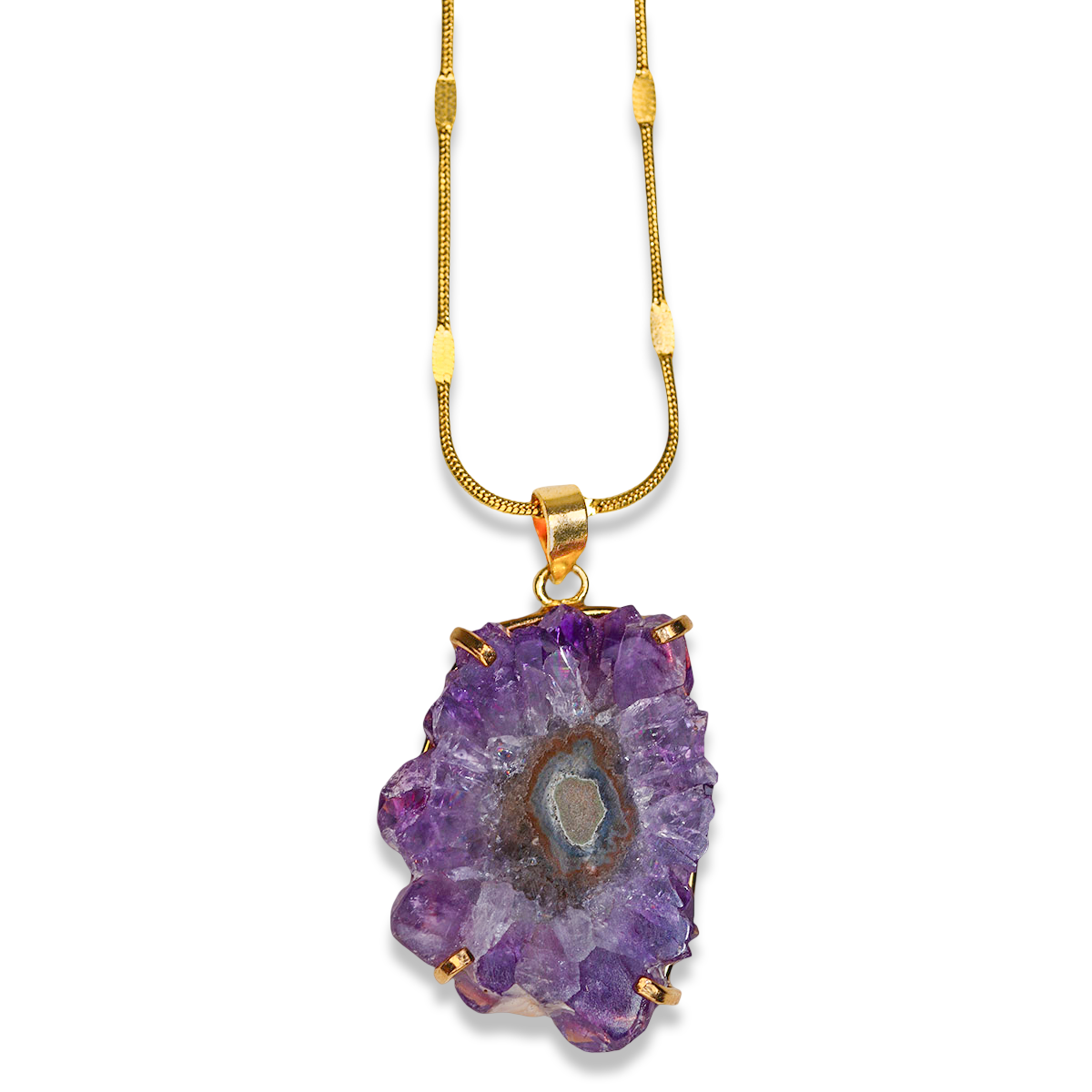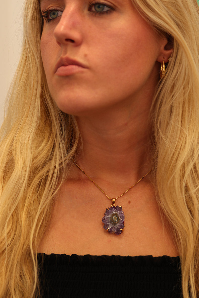 Stunning & rare, you'll feel like a bohemian crystal queen! Rock a natural crystal flower that forms deep in the earth. In a crystal cave, sometimes the stalactites that form from the top of the cave by dripping down over MILLIONS of years, get covered in crystals. Estimated to be 130 million years old! When you slice it, it looks like a flower inside! It just blows my mind. Each stone is one-of-a-kind as in nature. I spend hours going through 100's to hand select the prettiest stalactites for you!