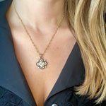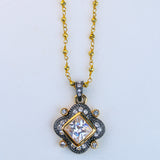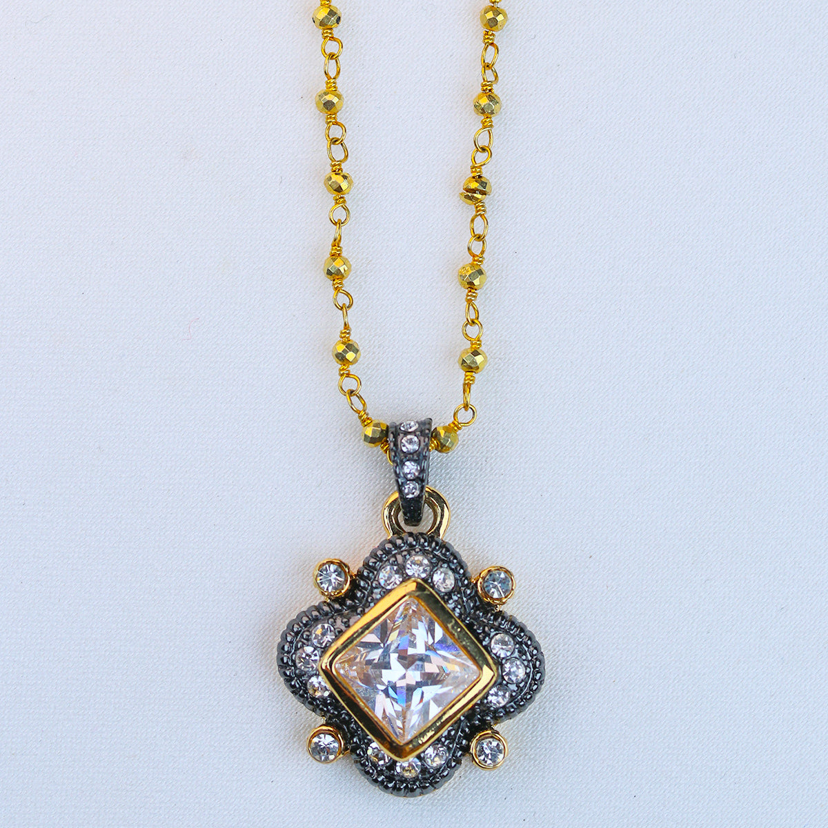 Edgy, sparkly, mixed metal goodness! Black + Gold to match everything! Black rhodium and 14k gold plated stainless steel charm with cubic zirconia crystals. On a hand wire wrapped gold filled chain.