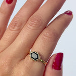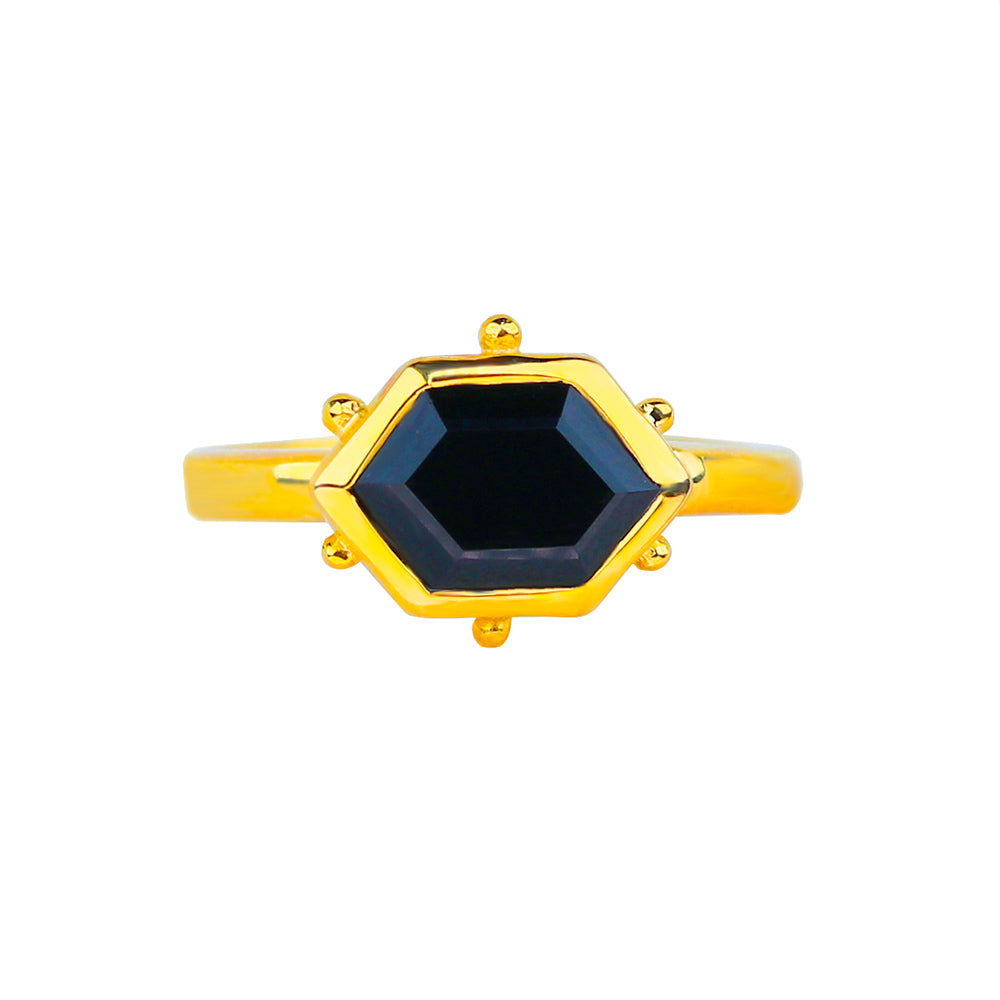 Black onyx, believed to be the strongest stone in blocking bad energy, as a protection stone. Cut into an "evil" eye shape, to double your protection as your 3rd eye watching out for you. Faceted to catch the light, set in water resistant gold, for daily wear.