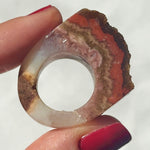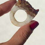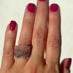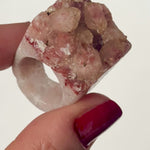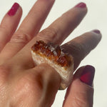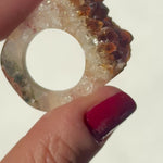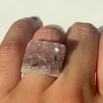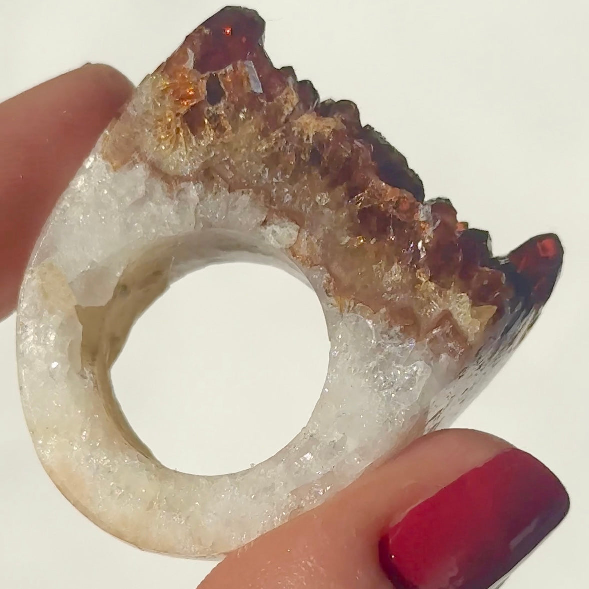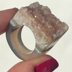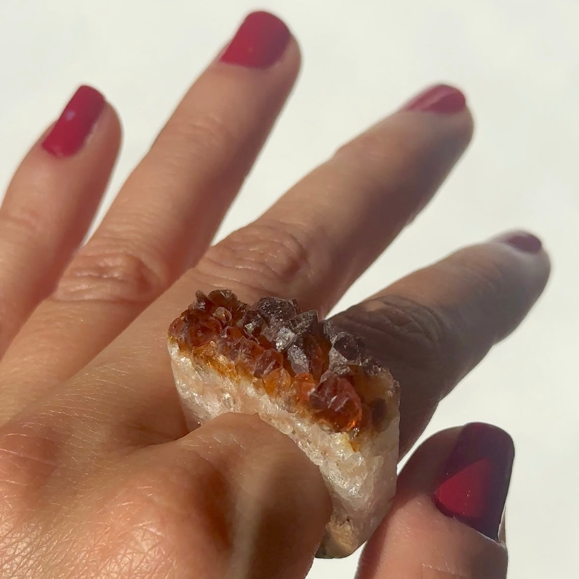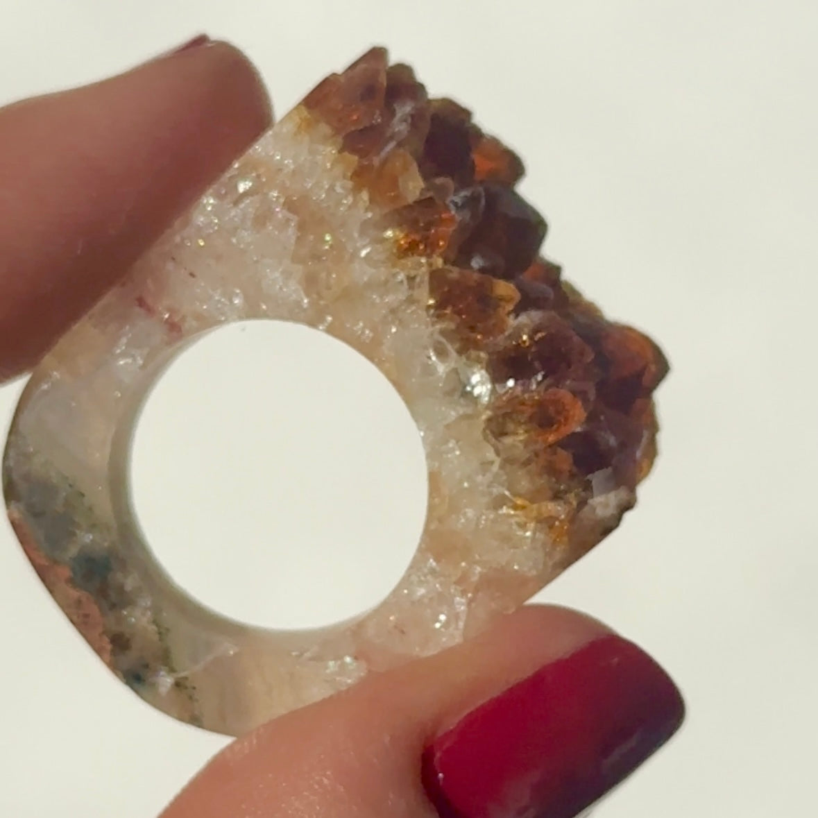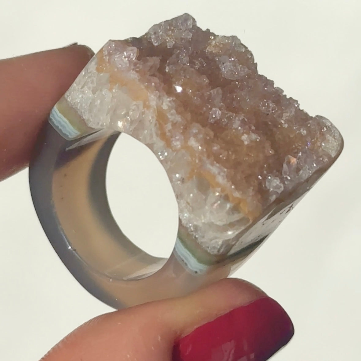 My obsession can now be yours my friends! Big, bold, bad a**, bling that can pack a punch. And it is mesmerizing in the light as it sparkles like no other! I work with a family run mine in Brazil, where each stone is hand carved into rings. Each is entirely carved from one stone, where the natural druzy crystal formation is showcased on top. Thick bands fit tight so if in doubt size up, do not size down. Sizes are listed at 6.5/7 (for example) because it fits differently if your fingers swell. Fits like a 6.5 when hot/swollen, 7 when cold. To choose your exact piece, watch the videos, as they are in exact order. Stones cannot be resized. Reach out with any questions on email or Instagram dm! When sold, it's gone forever, and can never be recreated!