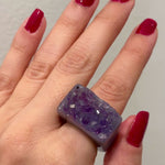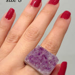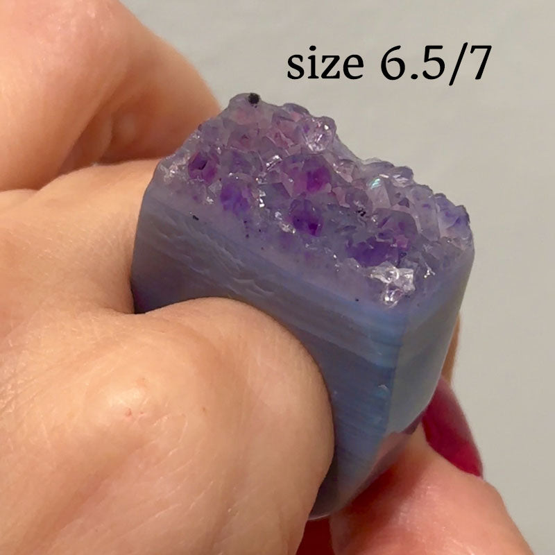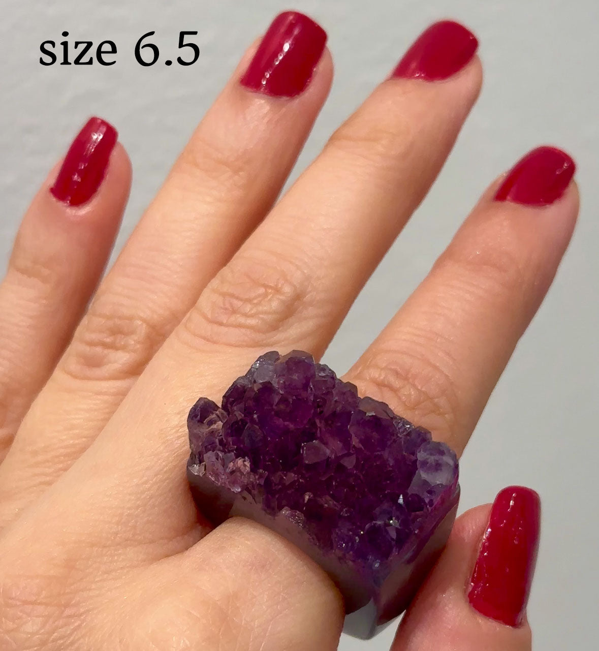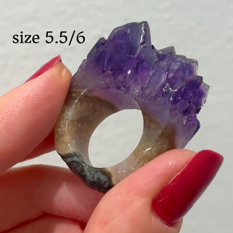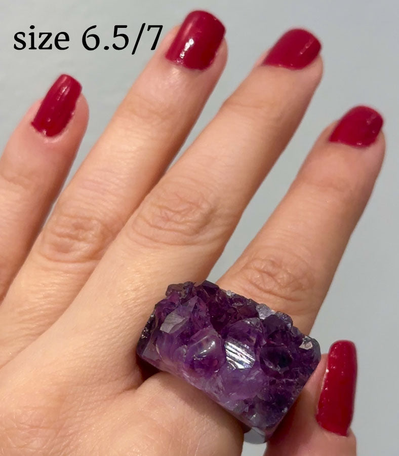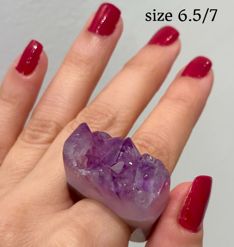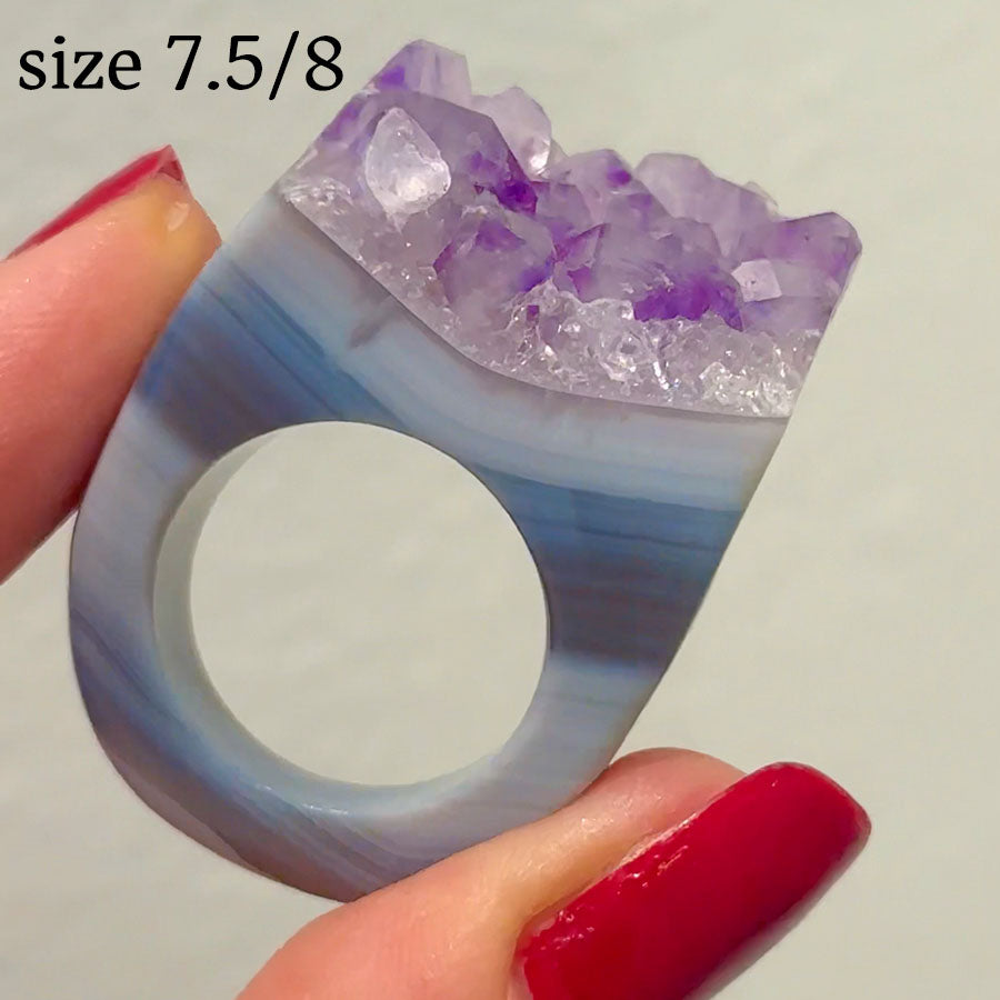 My obsession can now be yours my friends! Big, bold, bad a**, bling that can pack a punch. And it is mesmerizing in the light as it sparkles like no other! I work with a family run mine in Brazil, where each stone is hand carved into rings. Each is entirely carved from one stone, where the natural druzy crystal formation is showcased on top. Thick bands fit tight so if in doubt size up, do not size down. Sizes are listed at 6.5/7 (for example) because it fits differently if your fingers swell. Fits like a 6.5 when hot/swollen, 7 when cold. To choose your exact piece, watch the videos, as they are in exact order. Stones cannot be resized. Reach out with any questions on email or Instagram dm! When sold, it's gone forever, and can never be recreated!