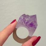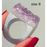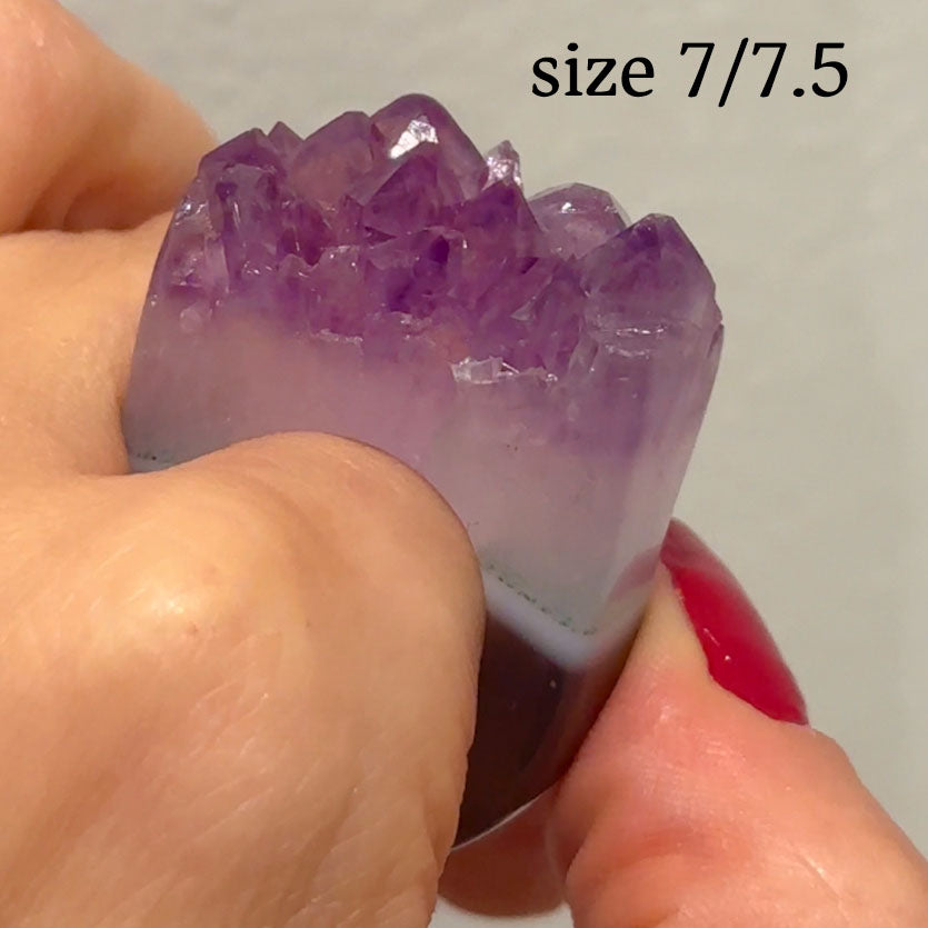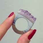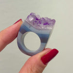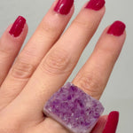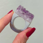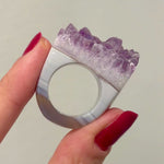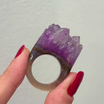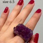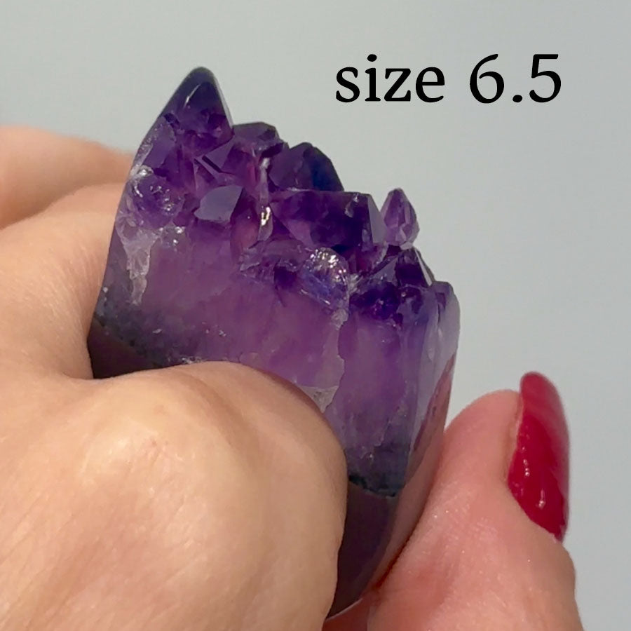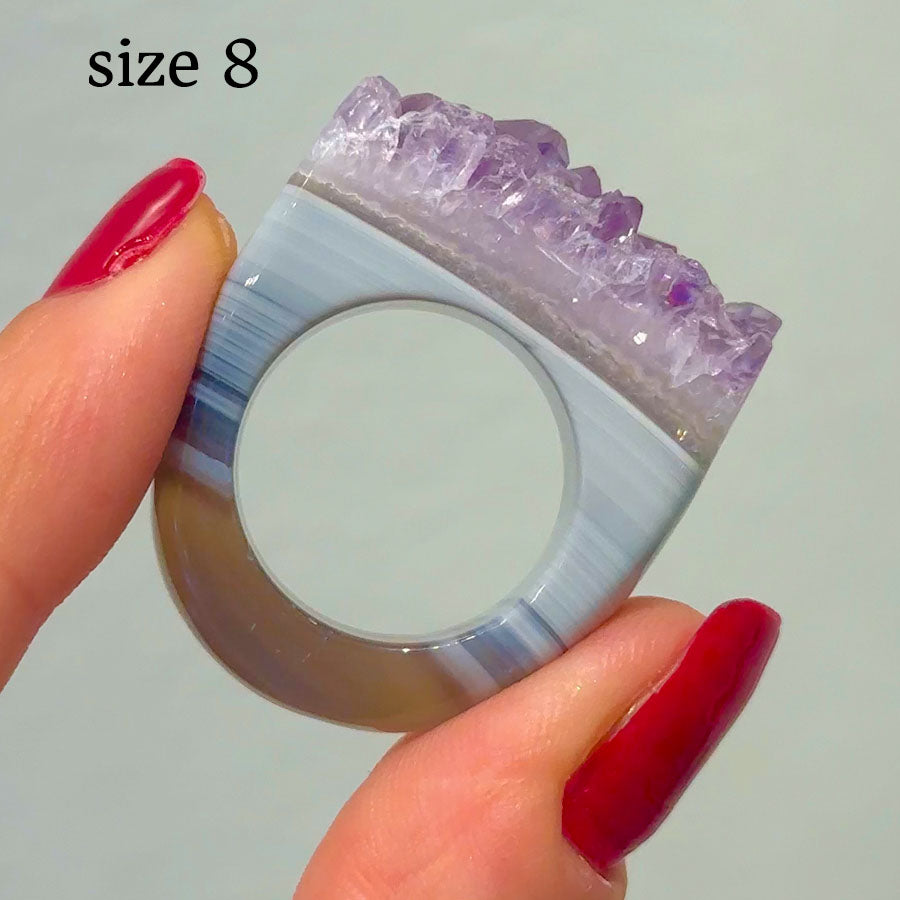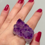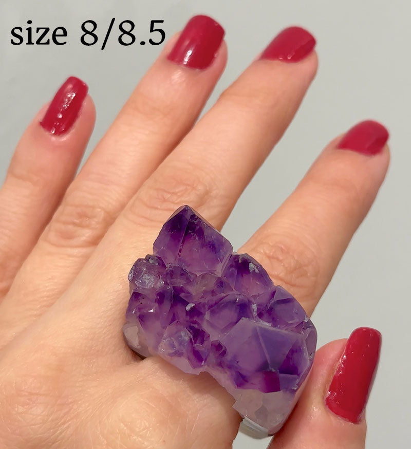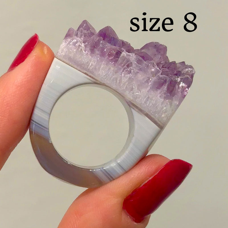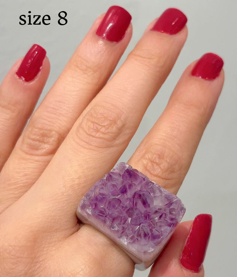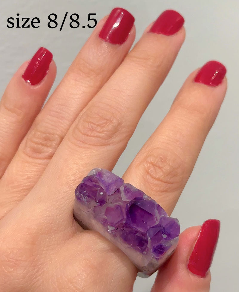 My obsession can now be yours my friends! Big, bold, bad a**, bling that can pack a punch. And it is mesmerizing in the light as it sparkles like no other! I work with a family run mine in Brazil, where each stone is hand carved into rings. Each is entirely carved from one stone, where the natural druzy crystal formation is showcased on top. Thick bands fit tight so if in doubt size up, do not size down. Sizes are listed at 6.5/7 (for example) because it fits differently if your fingers swell. Fits like a 6.5 when hot/swollen, 7 when cold. To choose your exact piece, watch the videos, as they are in exact order. Stones cannot be resized. Reach out with any questions on email or Instagram dm! When sold, it's gone forever, and can never be recreated!