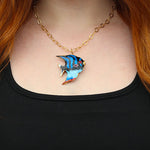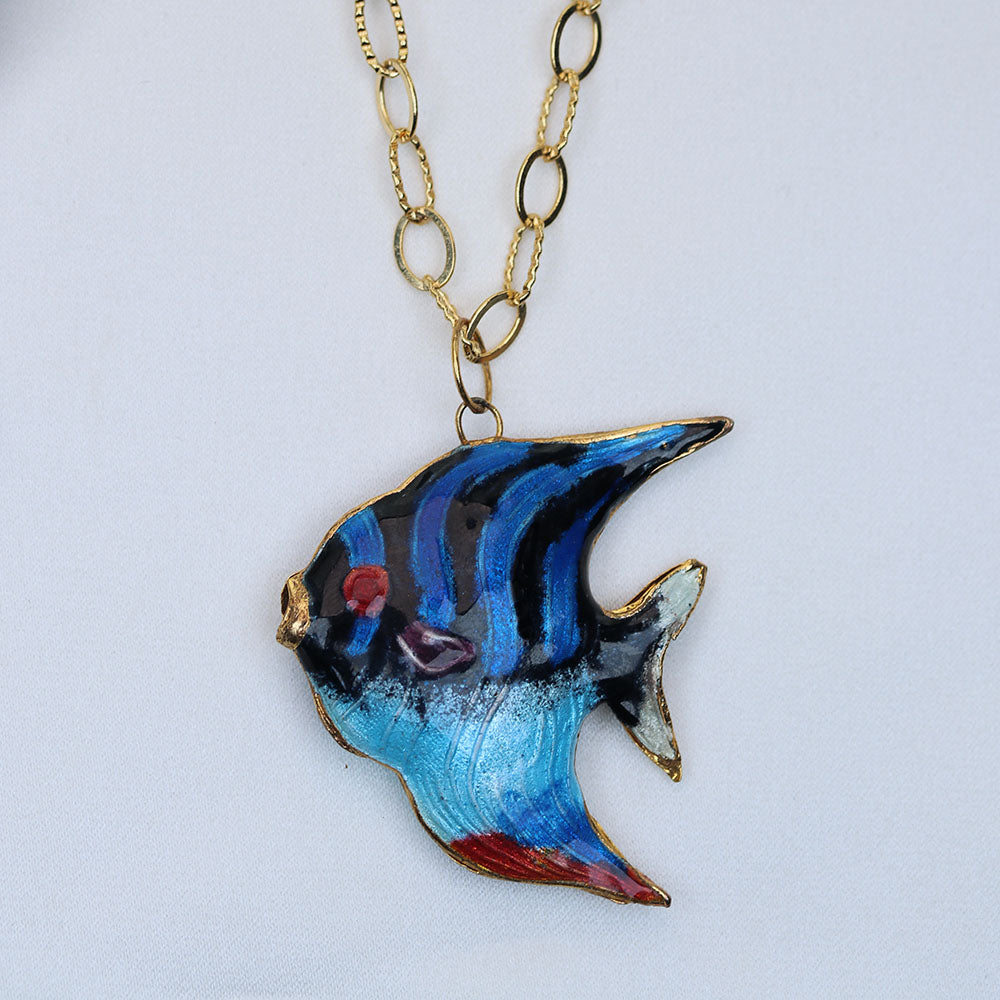 Intricately hand painted enamel, this necklace is a wearable work of art! Enameling is an old-world technique, seen throughout museums worldwide. Glass paste is hand painted onto the metal base, then baked in a kiln like pottery, layer by layer, 5+ times, creating a durable finish that stands the test of time. Each enamel piece is one of a kind, as it's painted by hand. It's on a 18" gold chain in which you can link into any link to shorten.