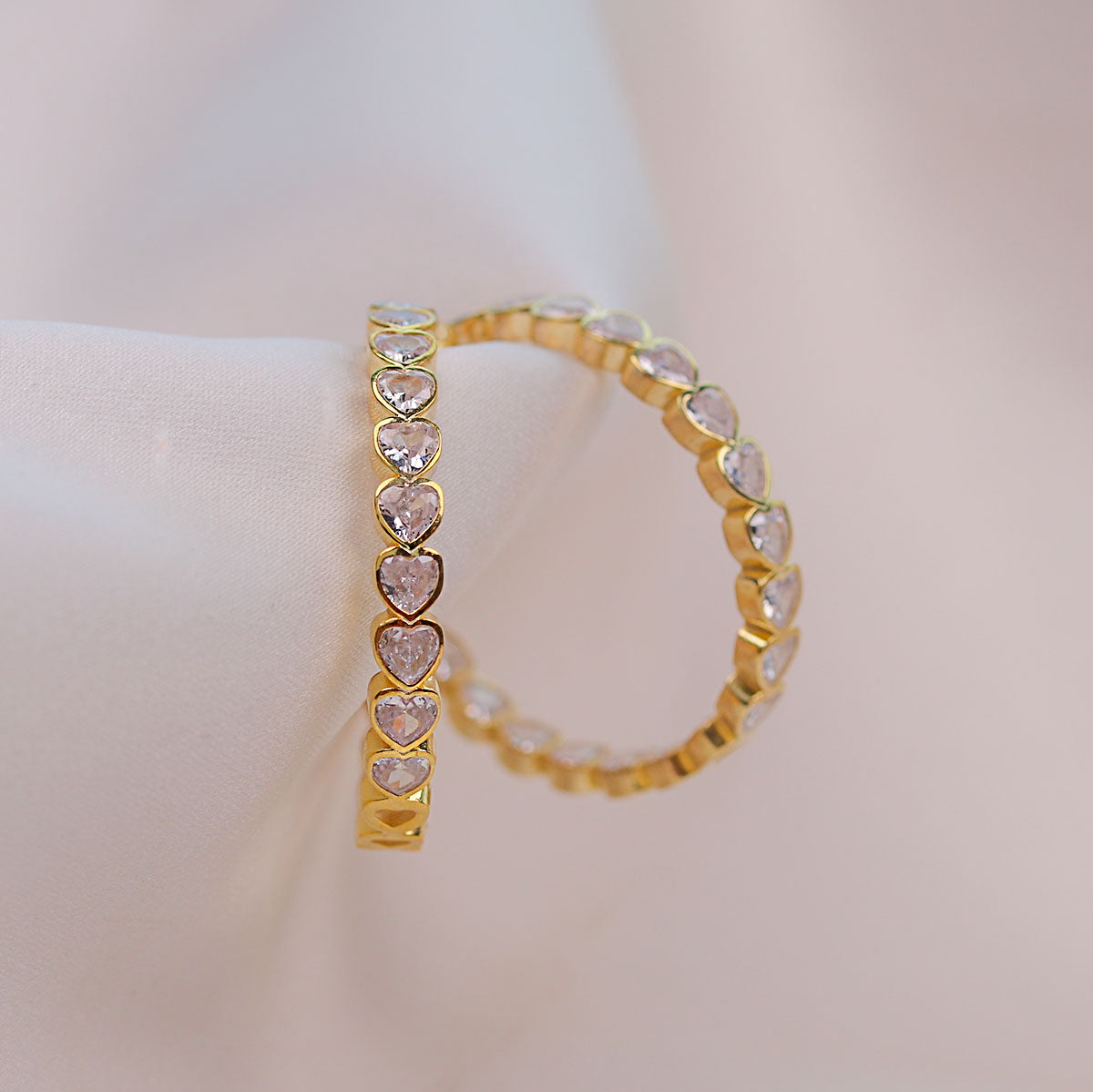 Spread love with hoops filled with high shine heart crystals! Truly statement making, unique, and just stunning. Rows of perfectly bezel set cubic zirconias that shine like diamonds! Made from 14k plated solid sterling silver so your ears will love them too.