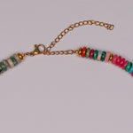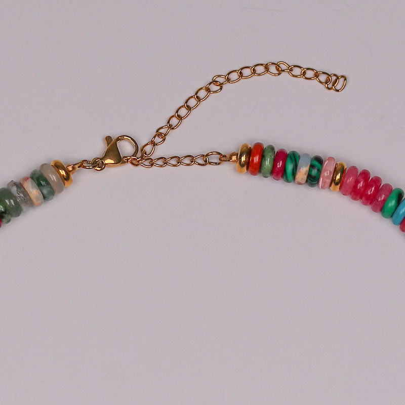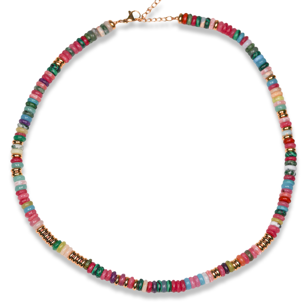 A mix of stones and waterproof gold fill beads, rainbow matches everything! The perfect chunky beads to be a statement, yet still lightweight on your neck. Wear it alone or layered with other necklaces! The rainbow color mix makes it a perfect year round, summer and fall colors combined!