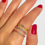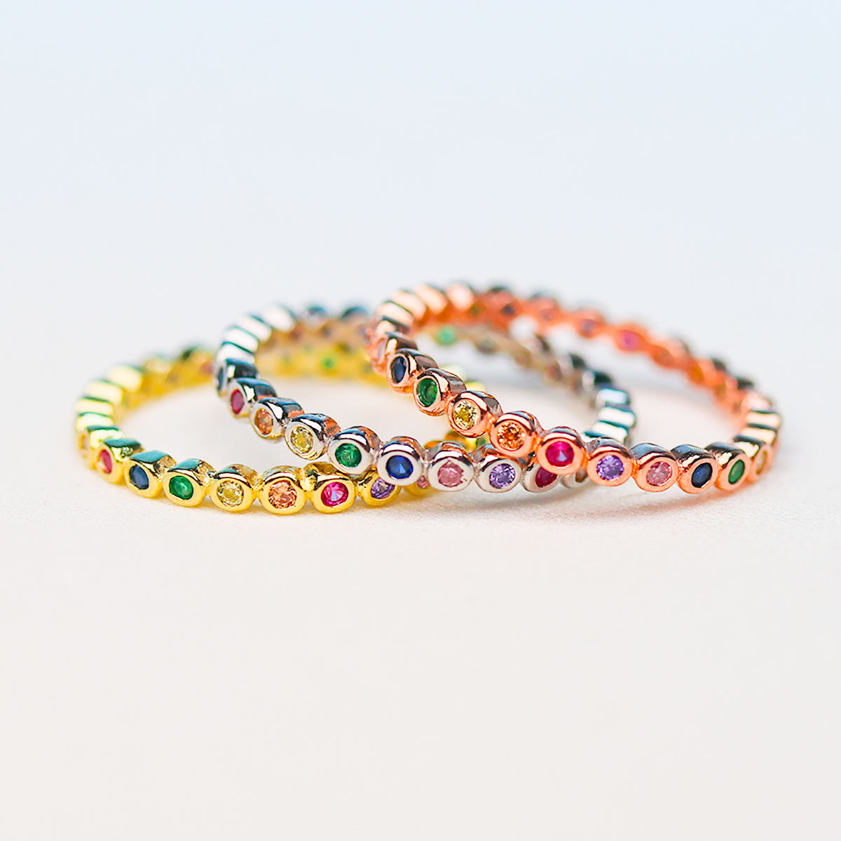 Gaze into a rainbow array of sparkly gems all day! Choose your favorite metal color, and add it to your daily ring stack. Plus rainbow matches everything!
