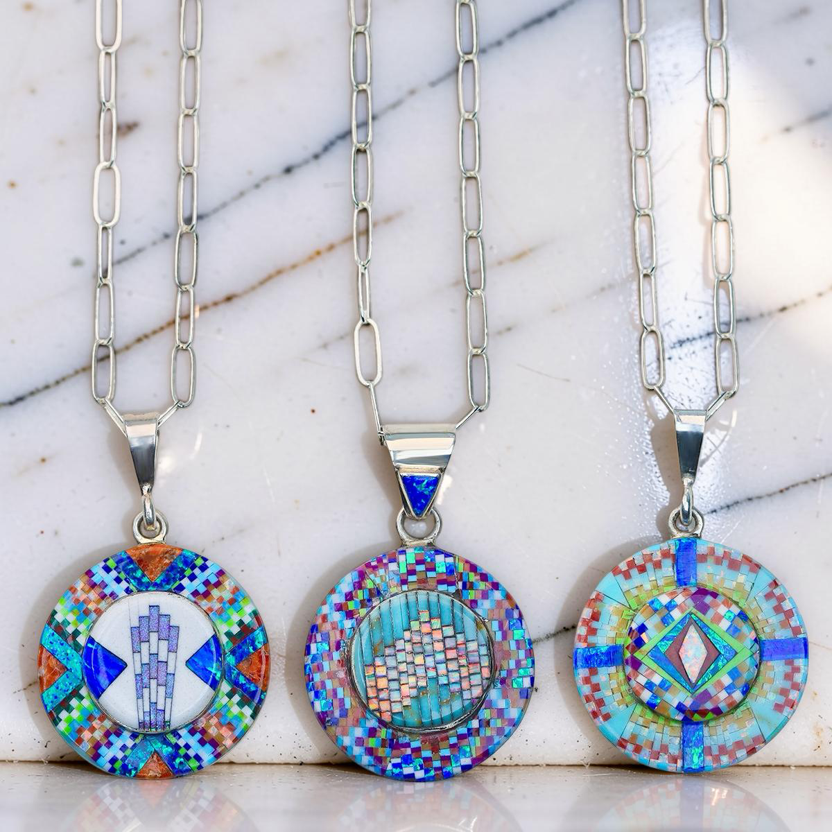 I proudly work with a Native American family, who create every piece, one by one for you. These jewels are mini masterpieces- each stone is hand cut & inlaid into this mosaic design, taking days to create.