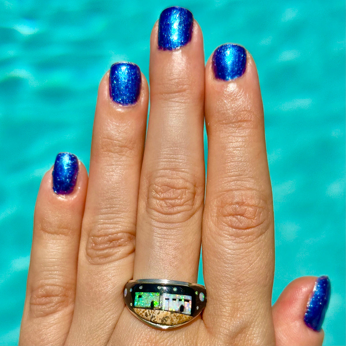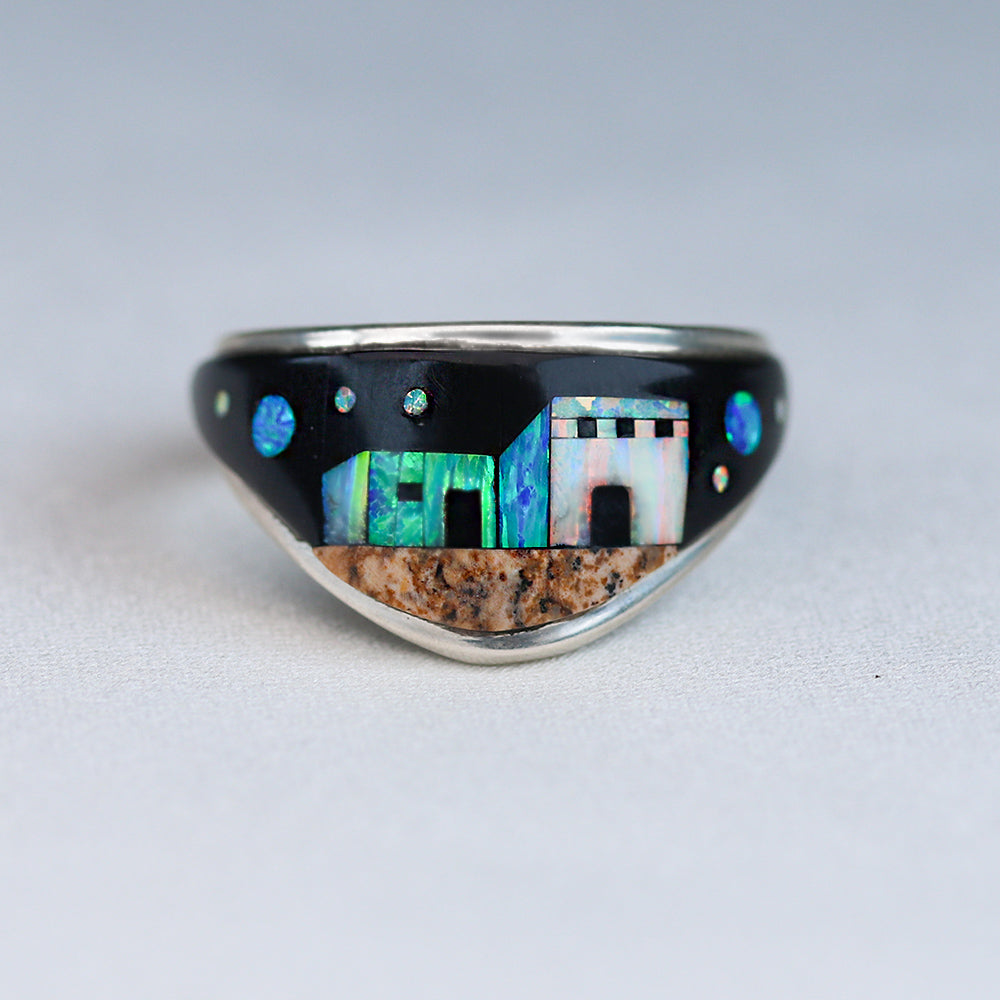 A mini masterpiece & a true collector's piece! Featuring Opal pueblos in the desert, surrounded by an ethereal starry night sky of planets & stars. I proudly work with a Native American family, who create every piece, one by one for you. Your purchase directly supports the artwork of the indigenous community. True collector's item!