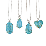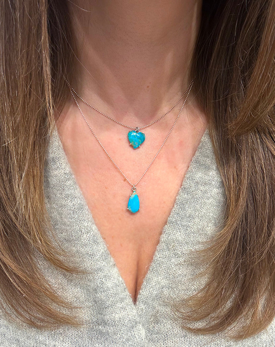 Turquoise has been considered a holy stone in many cultures dating back to ancient Egypt, and was used as a talisman for good fortune. Each pendant is high quality turquoise from Arizona and is one of a kind.