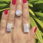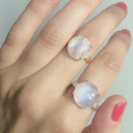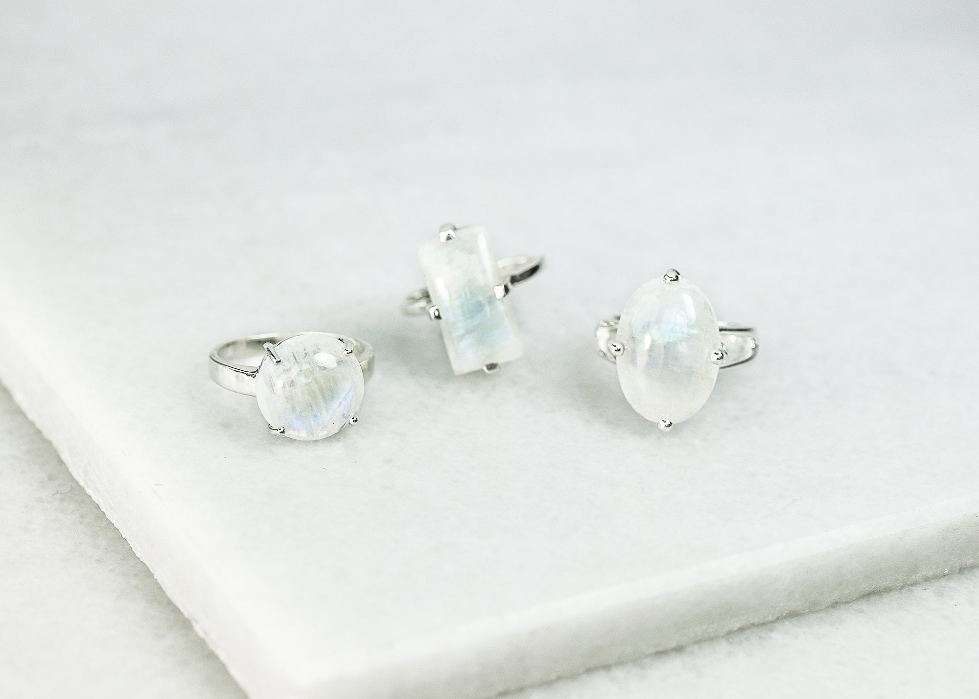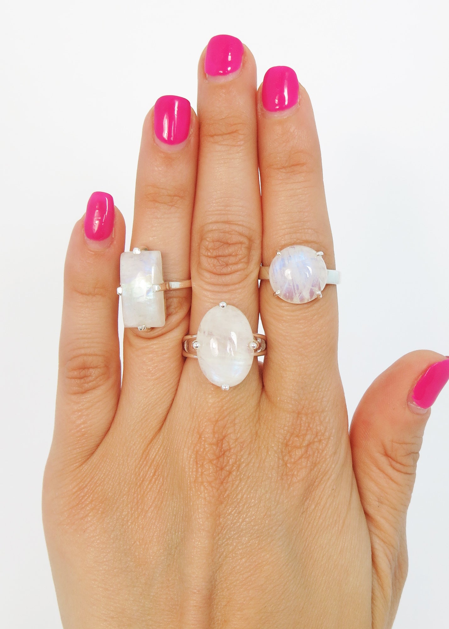 I can never get enough of that moonstone flash! Some have a blue flash, others blue and a tiny rainbow! Each stone is cut by hand, then the metal ring band is custom made to perfectly fit each stone.
