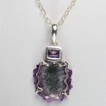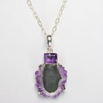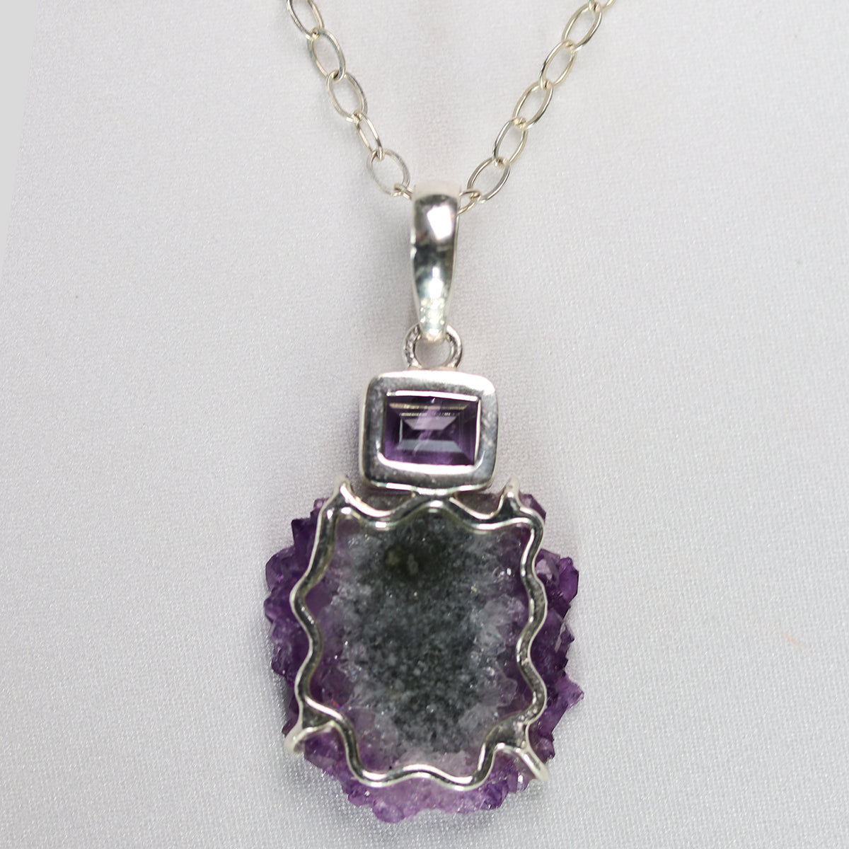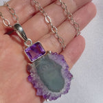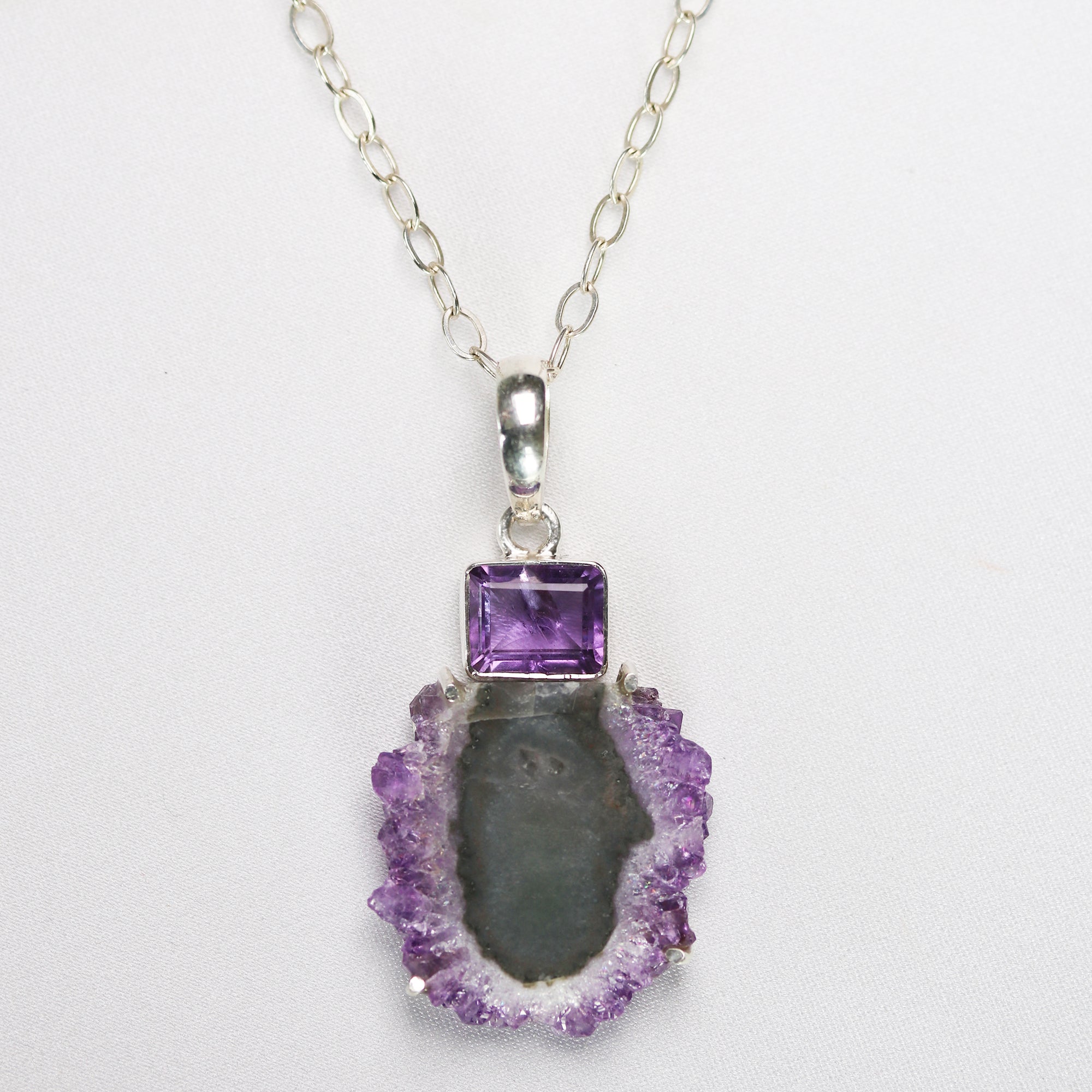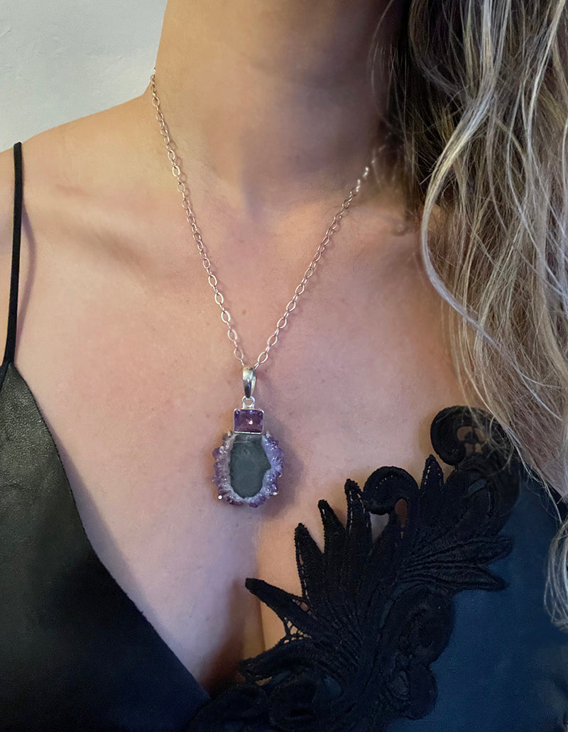 Stunning & rare, you'll feel like a bohemian crystal queen! Rock a natural crystal flower that forms deep in the earth. Featuring a rare stalactite slice from Uruguay paired with a faceted Amethyst crystal. In a crystal cave, sometimes the stalactites that form from the top of the cave by dripping down over MILLIONS of years, get covered in crystals. Estimated to be 130 million years old! When you slice it, it looks like a flower inside! It just blows my mind. Each stone is one-of-a-kind as in nature. I spend hours going through 100's to hand select the prettiest stalactites for you!