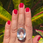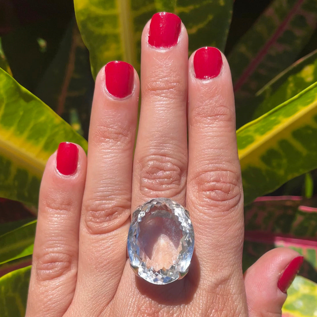 Va va voom! We can't afford a diamond this size, so we made it in faceted clear quartz! We absolutely LOVE this over the top cocktail ring! A conversation starter, selfie worthy, and all your friends will want to borrow it! Perfectly clear Grade A quartz, faceted to shine like a diamond. This ring is the perfect accessory for any occasion, for someone who is not afraid of attention. Make it a set with the Clear Quartz Stunner Necklace.