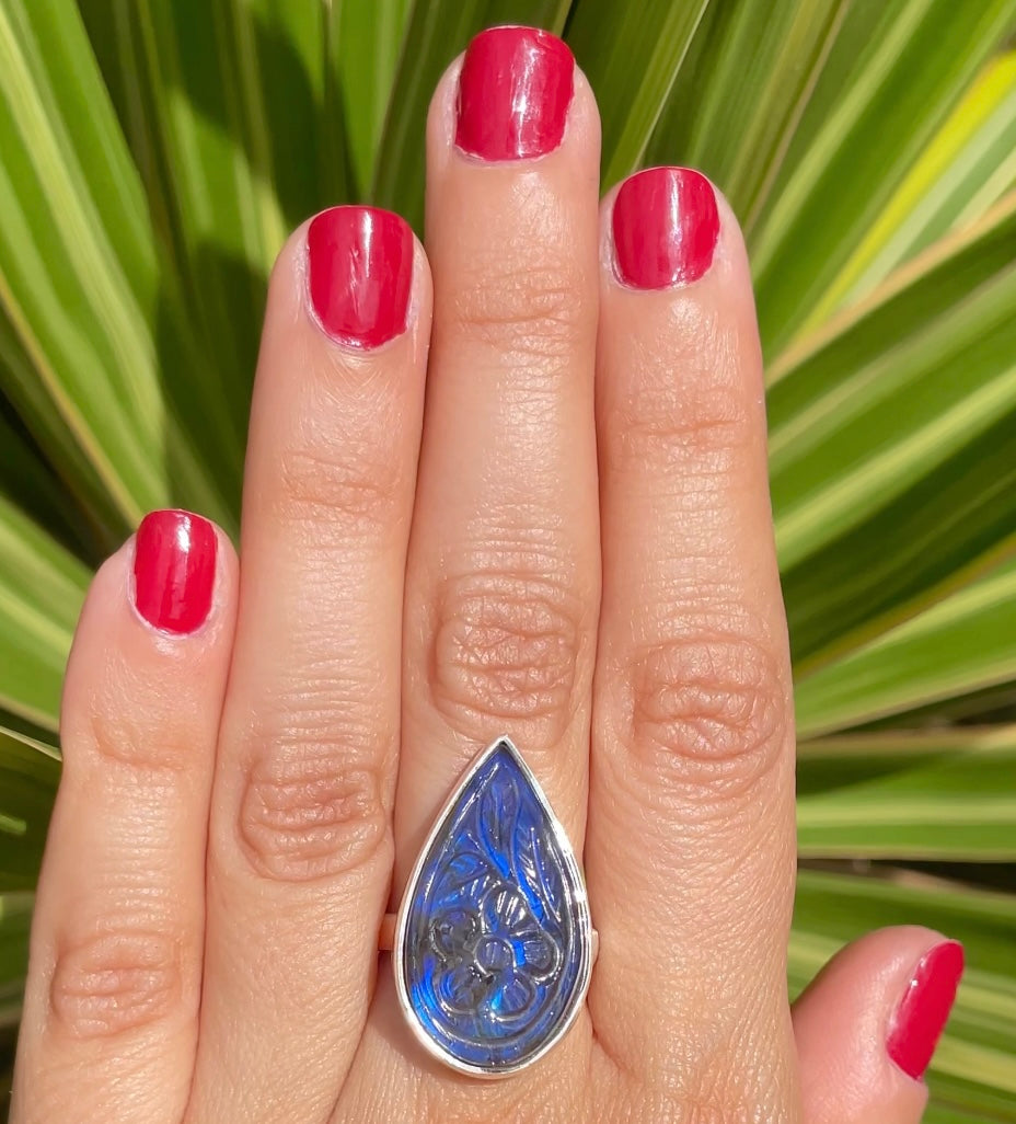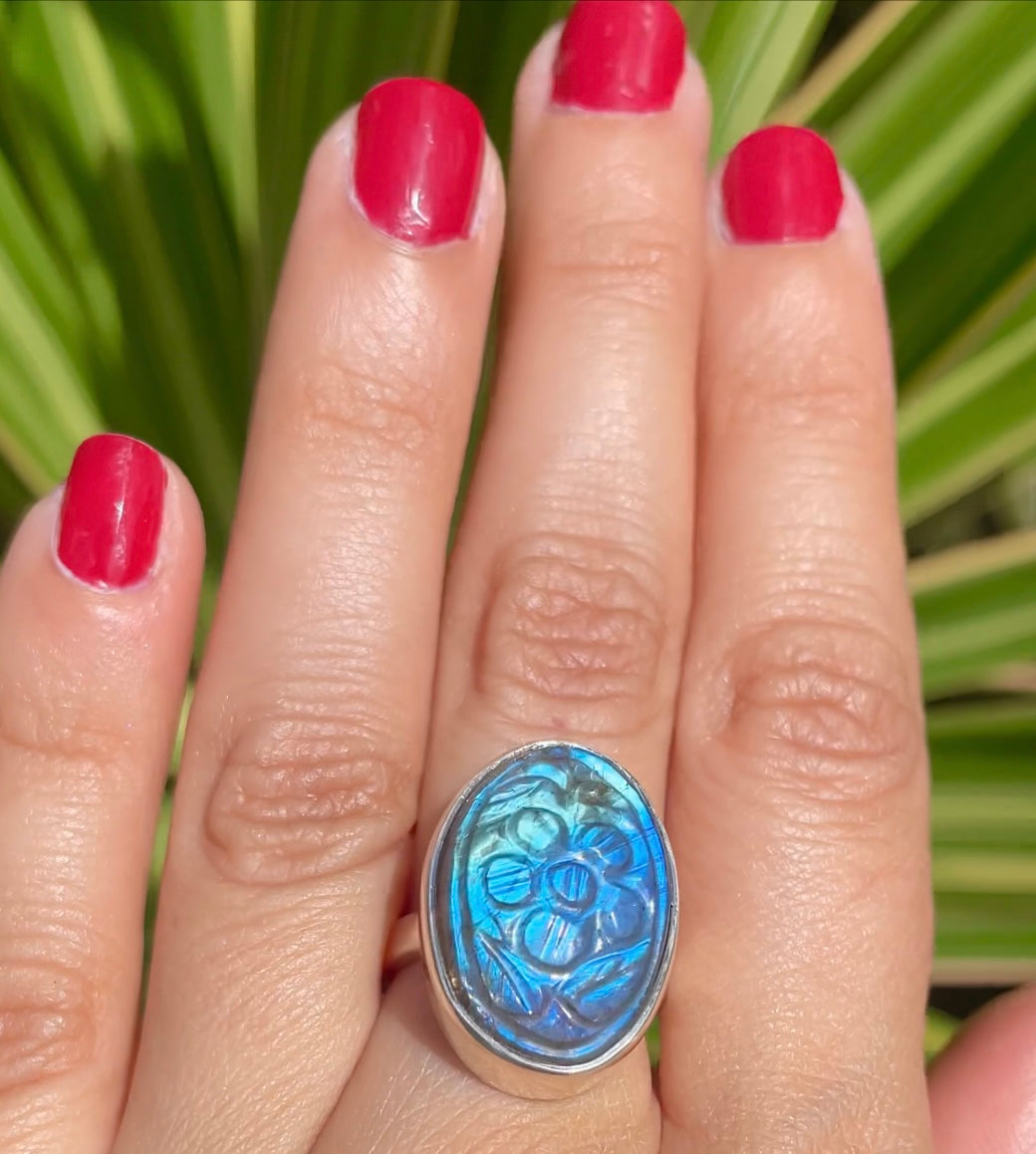 Hand carved flashy labradorites! Each is uniquely one of a kind & can never be recreated. Solid silver bands custom made to perfectly secure the stones. These are very strong rings that can be worn everyday, and safe to wash your hands with them on.