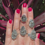 These sparkly pyrites filled with natural cube and glittery druzy crystal formations create their high shine! These pyrites are from Tibet, and the entire group is from the same mine pocket. I chose each stone, one by one, to get you the best of the best! Each piece of pyrite is unique, so I added videos of each size group so you can choose your exact stone. Once an option is sold, it can never be recreated, as in nature. Each stone has a custom made strong bezel setting to perfectly secure the stone. Pyrite are the perfect neutral for everyday, and pair well with other rings on your hand. You won't be able to take your eyes off their unique sparkle!