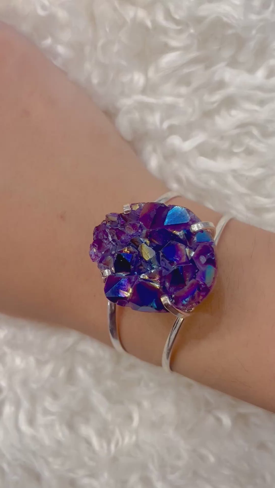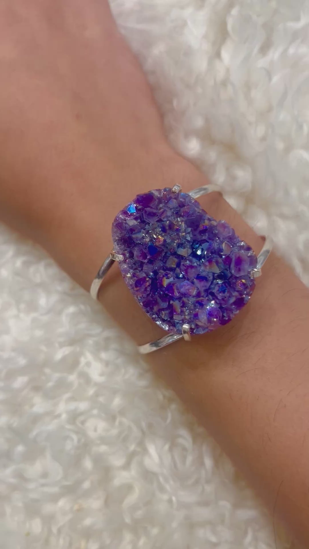 Feel like a bohemian queen wearing this Aura Amethyst crystal! These are raw, natural amethyst crystals, electroplated in titanium metal, to give the rainbow effect. I have been working with a family run mine for 9 years, where these are ethically mined.