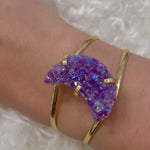 Feel like a bohemian queen wearing this Aura Amethyst crystal! These are raw, natural amethyst crystals, electroplated in titanium metal, to give the rainbow effect. I have been working with a family run mine for 9 years, where these are ethically mined.