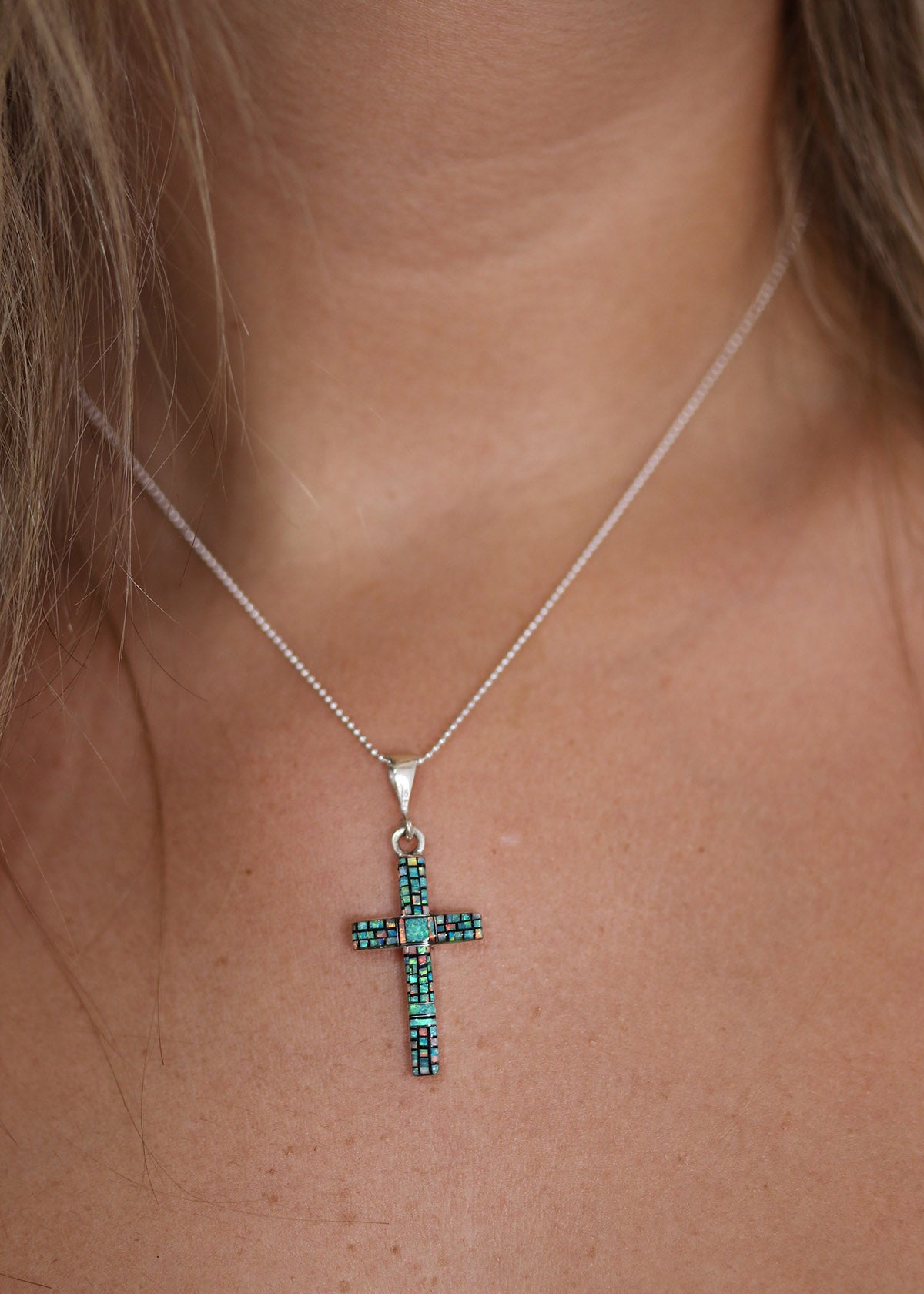 This cross necklace is such a cute & wearable collector's piece! These jewels are mini masterpieces- each piece of opal is hand cut & inlaid into this mosaic design! All hand forged sterling silver. The chain is made in Italy, a solid sterling chain of strong interlocking links.
